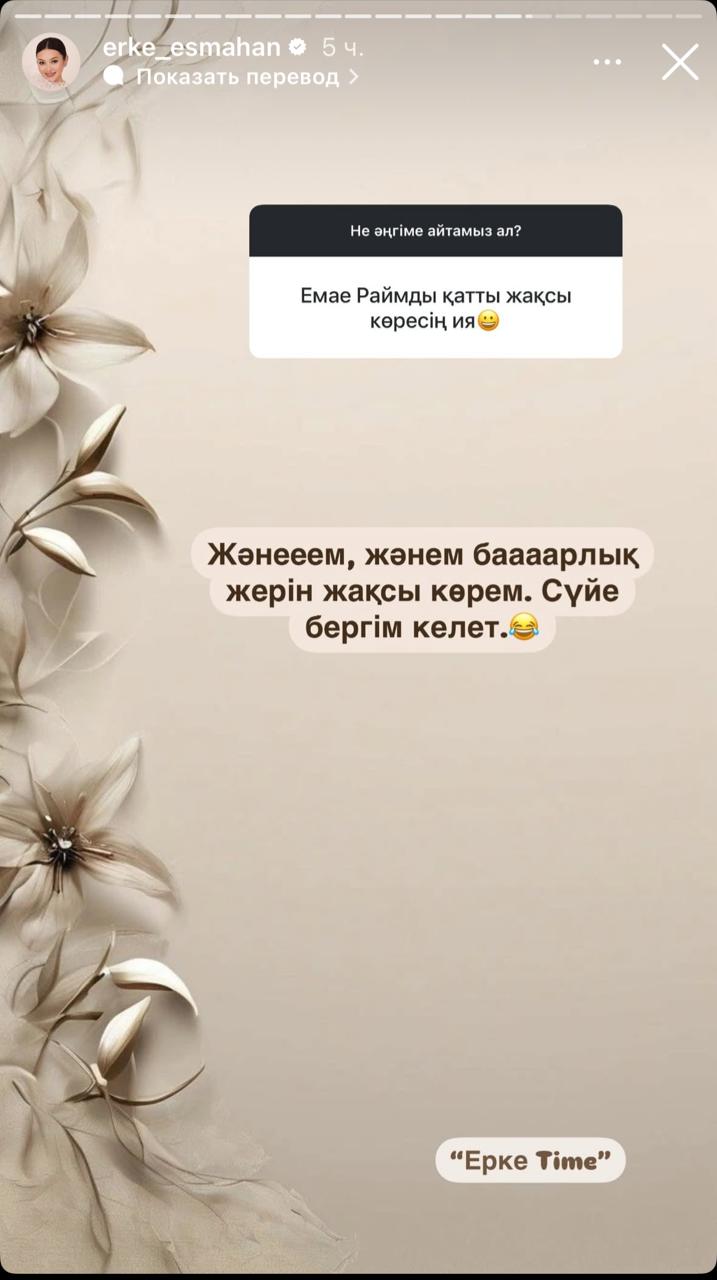-Жәнеем, жәнем баааарлық жерін жақсы көрем. Сүйе бергім келеді", деп қағыта, әзілмен жауап берді.