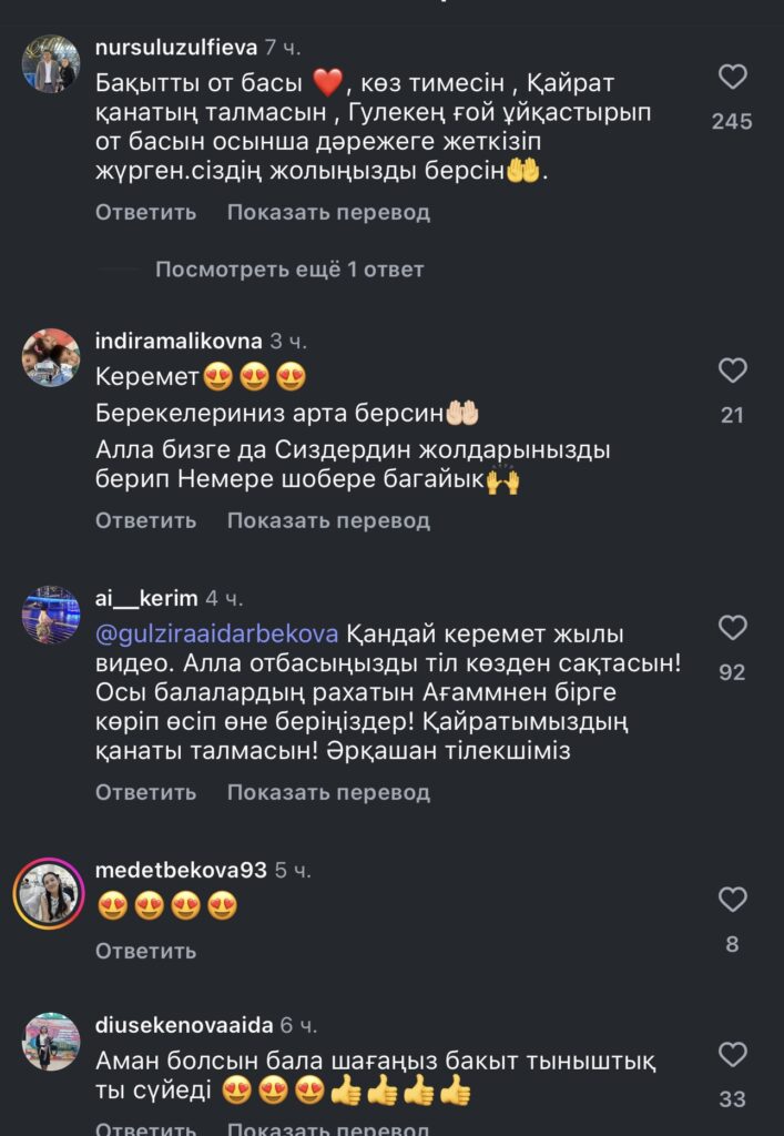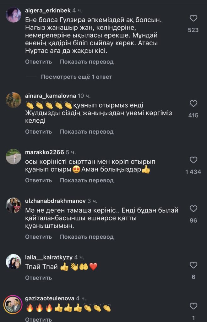 ”Бақытты отбасы, көз тимесін. Қайраттың қанаты талмасын. Гүлекең ғой отбасын осынша дәрежеге жеткізіп жүрген”, “Берекелеріңіз арта берсін”, “Қуанып отырмыз, енді Жұлдызды сіздің жаныңыздан үнемі көргіміз келеді”, — деп жазды ол.