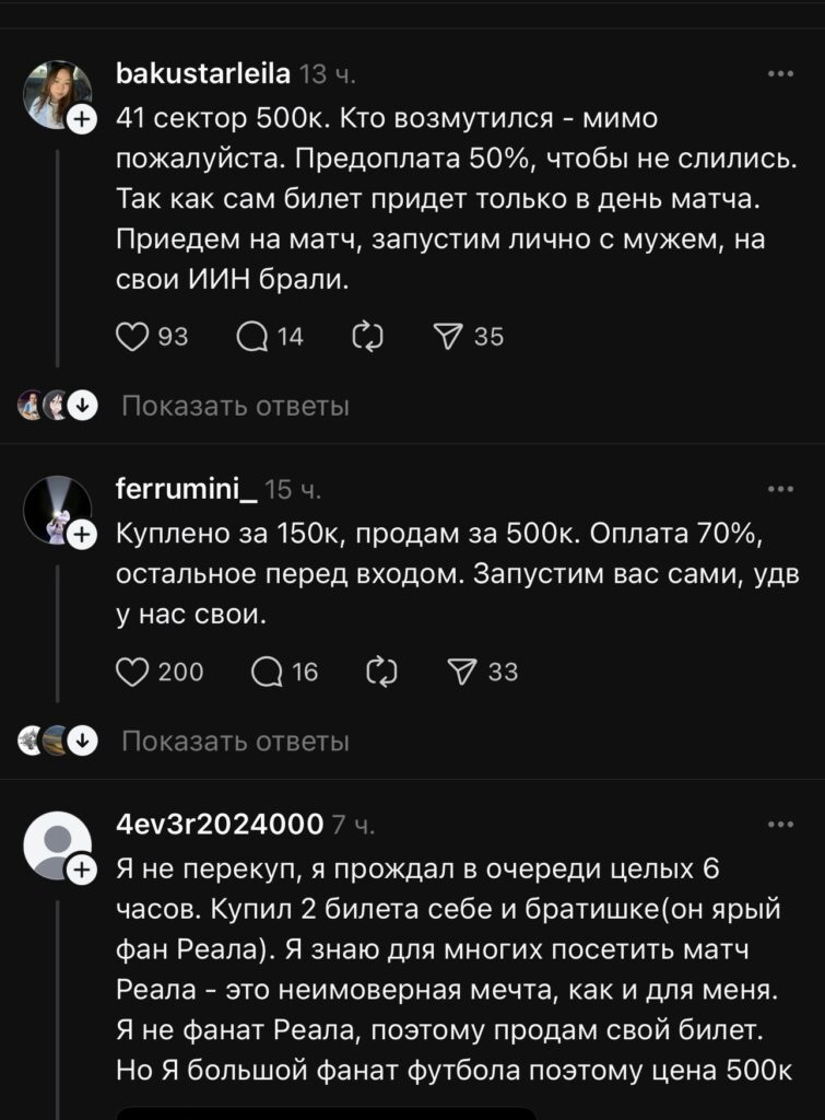 Алайда көп ұзамай әлеуметтік желілерде алыпсатарлар билеттерді қайтадан саудалай бастады. Қазір олар билеттің құнын бірнеше есеге көтеріп, тіпті 1 миллион теңгеге дейін ұсынып отыр.