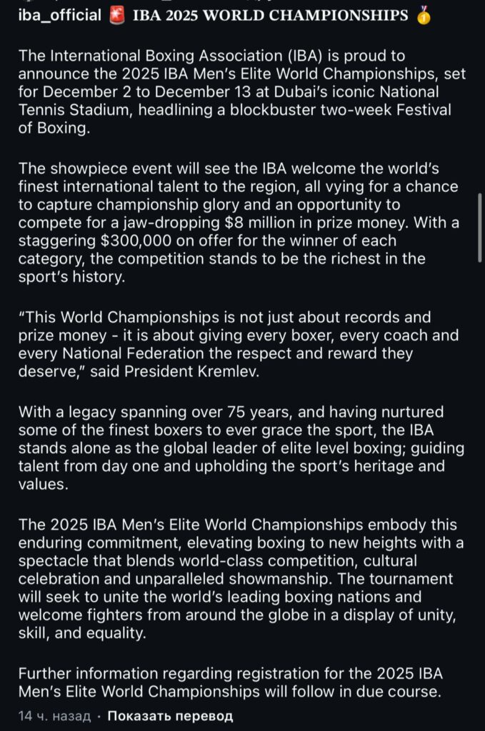 “Бұл әлем чемпионаты тек рекордтар мен жүлде қоры туралы емес. Ол әрбір боксшыға, әрбір бапкерге және әрбір ұлттық федерацияға лайықты құрмет пен марапат беруді көздейді”, – деді IBA президенті Кремлёв.