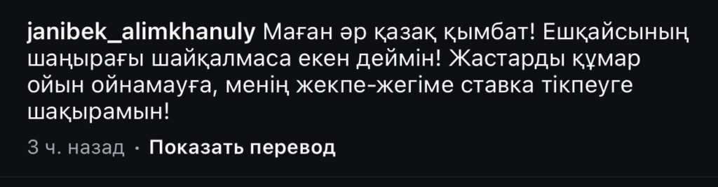 “Маған әр қазақ қымбат! Ешқайсының шаңырағы шайқалмаса екен деймін! Жастарды құмар ойын ойнамауға, менің жекпе-жегіме бәс тікпеуге шақырамын!”, – деп жазды Жәнібек Әлімханұлы Instagram желісіндегі парақшасында.