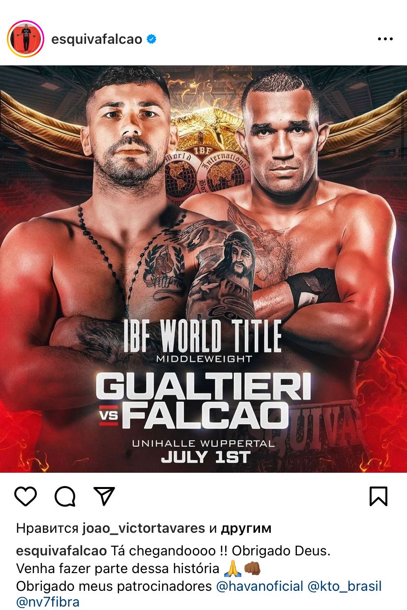 Боксшы жариялаған ресми постерде Фалькао — Гуальтьери кездесуі 1 шілдеде Вупперталь (Германия) қаласында өтетіні жазылған.