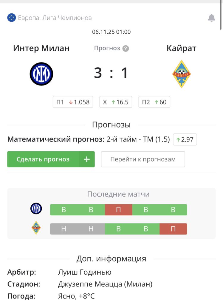 Сарапшылардың пікірінше, алдағы “Интер” мен “Қайрат” арасындағы матчта италиялық клуб айқын фаворит саналады. “Интер” Чемпиондар лигасының топтық кезеңінде әзірге бірде-бір ұпай жоғалтпай, қарсыластарына мүмкіндік бермей келеді. Команда шабуылда да, қорғаныста да тұрақты ойын көрсетіп отыр.