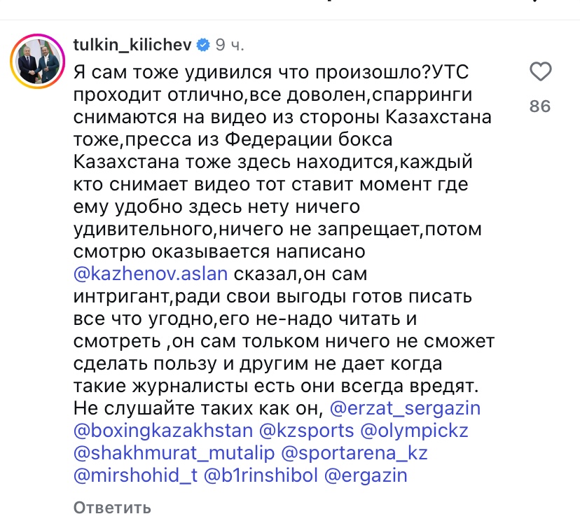 Бірер күн бұрын спорт журналисі Аслан Қаженов Өзбекстан тарапына қатысты “бірлескен жаттығу кезінен тек қазақ боксшылары таяқ жеген видеоларды әлеуметтік желіде жариялады” деген пікір білдірген еді.