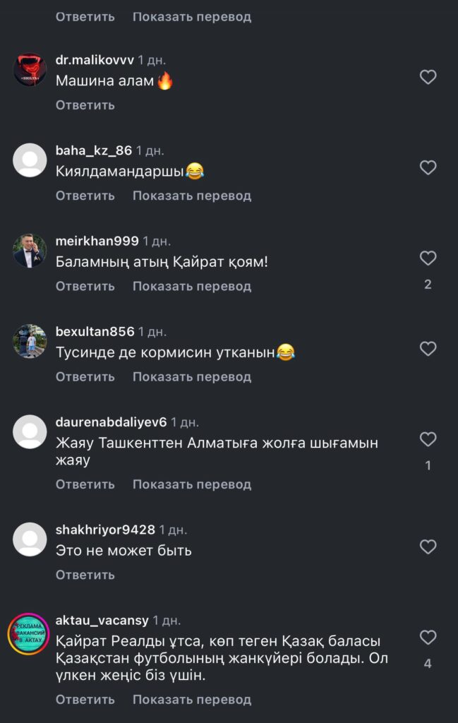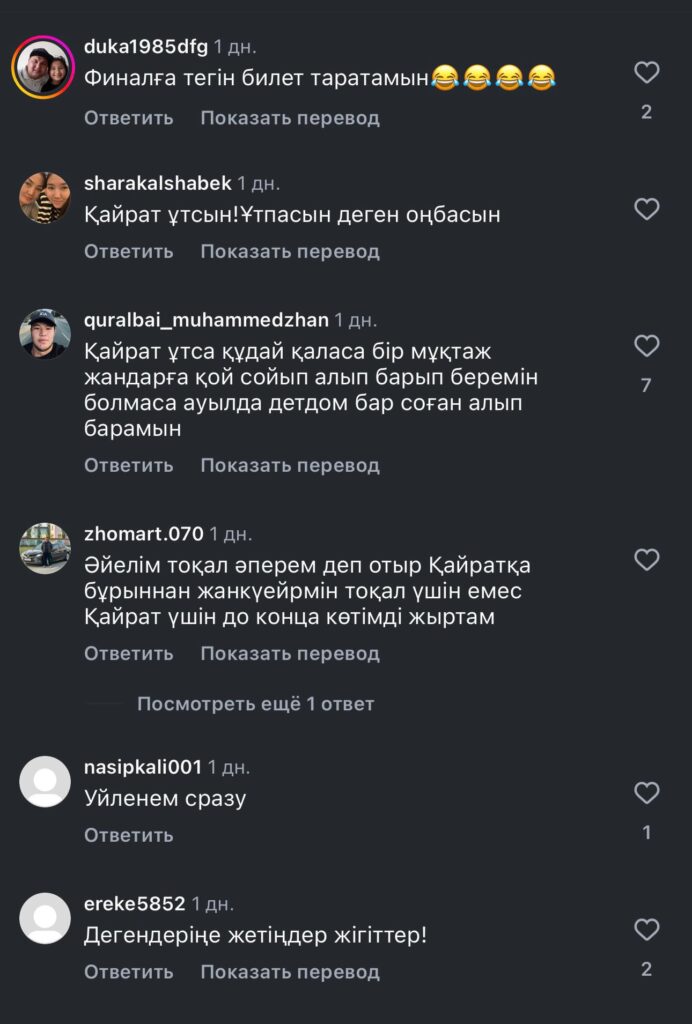 Осы ретте көпшілік «Қайратқа» тек сенім білдіріп қана қоймай, креативке толы идеялары арқылы ойынға деген ыстық ықыластарын білдіріп жатқанын байқауға болады. Мәселен, «Егер Қайрат ұтса, бірден үйленемін!» деп уәде беріп жатқан жанкүйердің санында шек жоқ. Ал тағы бірі «Қайраттың» ойыншыларының анасына былғары тон беретінін жазған.
