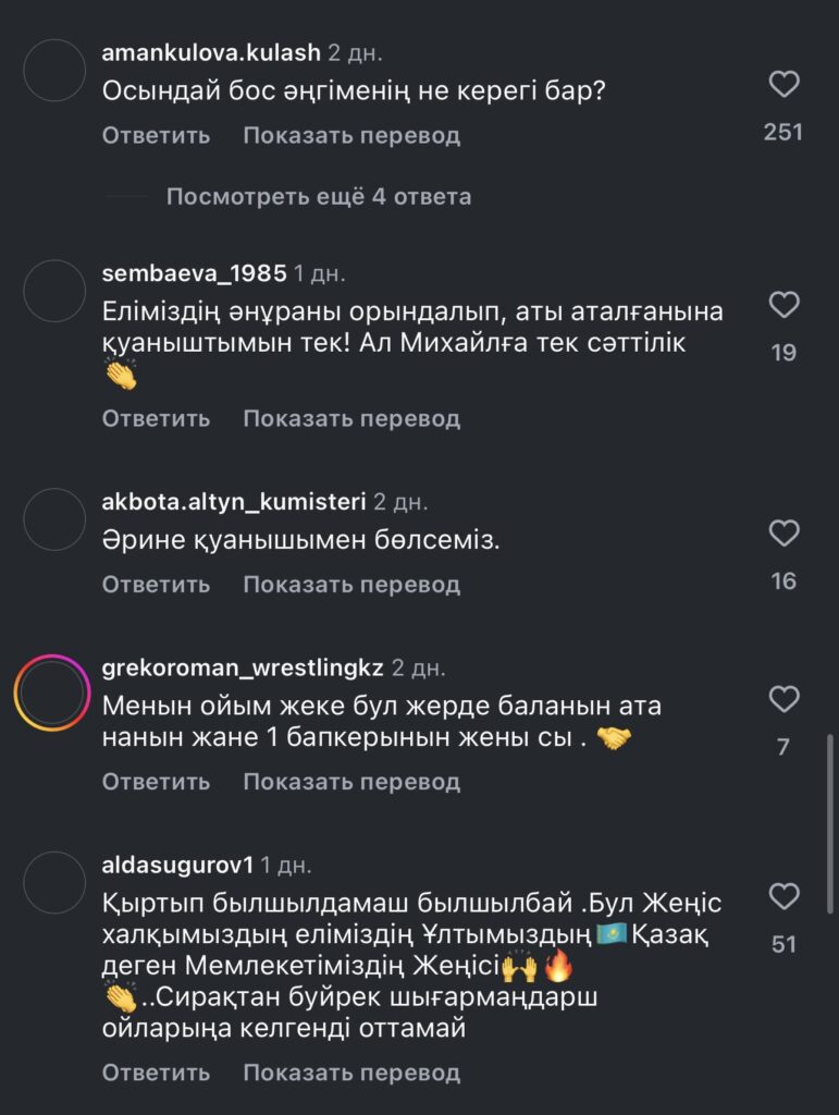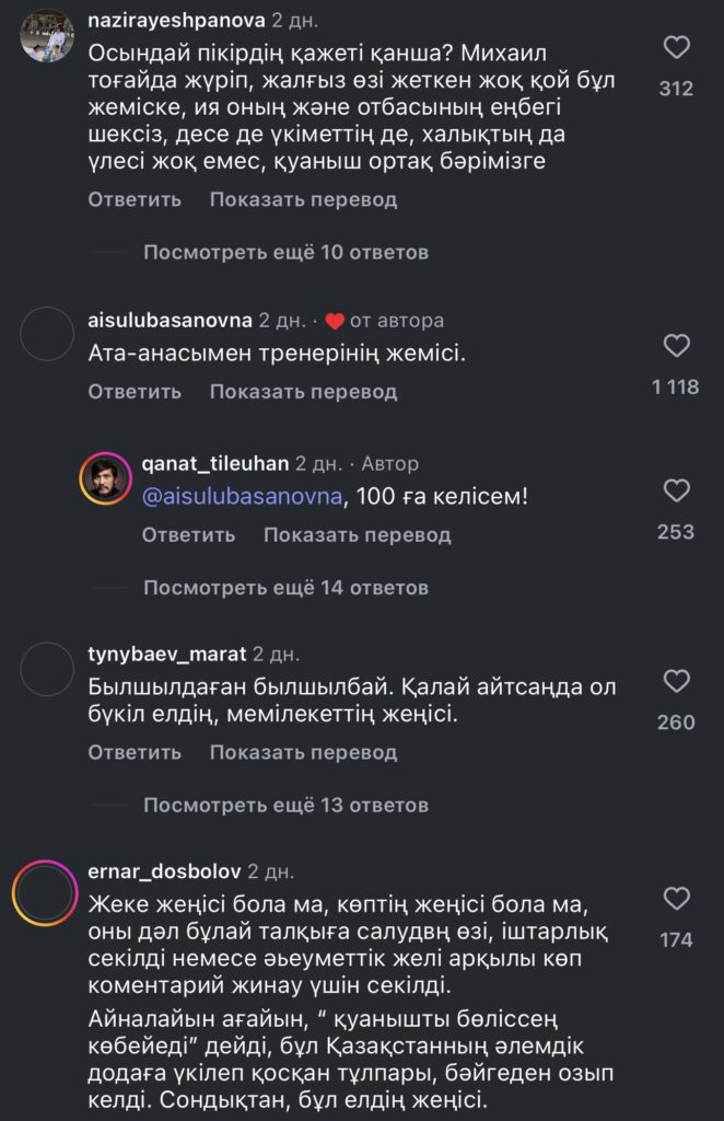 ”Осындай пікірдің қажеті қанша? Бұл жетістікке тоғайда жалғыз өзі жүріп жеткен жоқ қой. Қуаныш бәрімізге ортақ”, “Ата-анасы мен жаттықтырушысының жемісі”, “Қалай айтсаң да елдің, мемлекеттің жеңісі”, “Осындай бос әңгіменің не керегі бар”, — деп жазды олар.