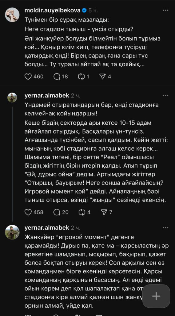“Қайрат — Реал Мадрид билет бағасын көріп стадионды туристер толтырады деп отырмын. Яғни Қайрат жанкүйерсіз ойнайды. Өздерінің таңдауы. Негізі таблоның айналасын тек жанкүйерлерге тиімді бағамен сатып, күшті перфоманс жасауға болар еді. Бірақ Қайрат ақшаны таңдады”, — деп жазды сценарист және футбол жанкүйері Нұрмахан Мұқанұлы.