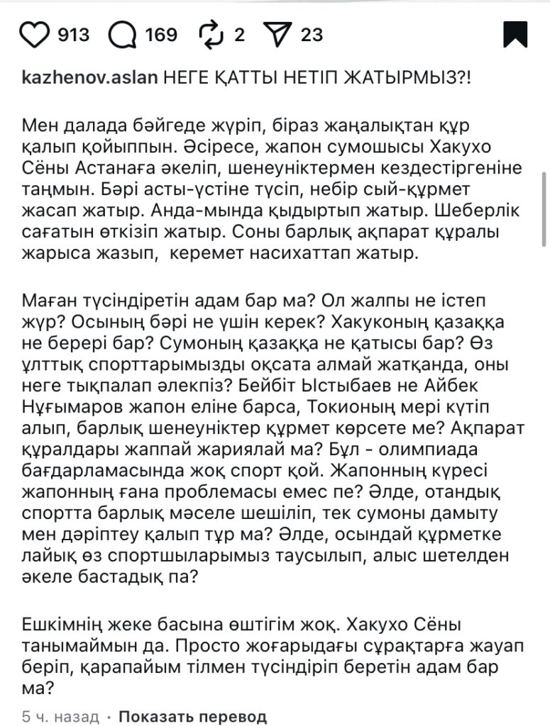 Ешкімнің жеке басына өштігім жоқ. Хакухо Сёны танымаймын да. Просто жоғарыдағы сұрақтарға жауап беріп, қарапайым тілмен түсіндіріп беретін адам бар ма?”, — деп жазды ол.
