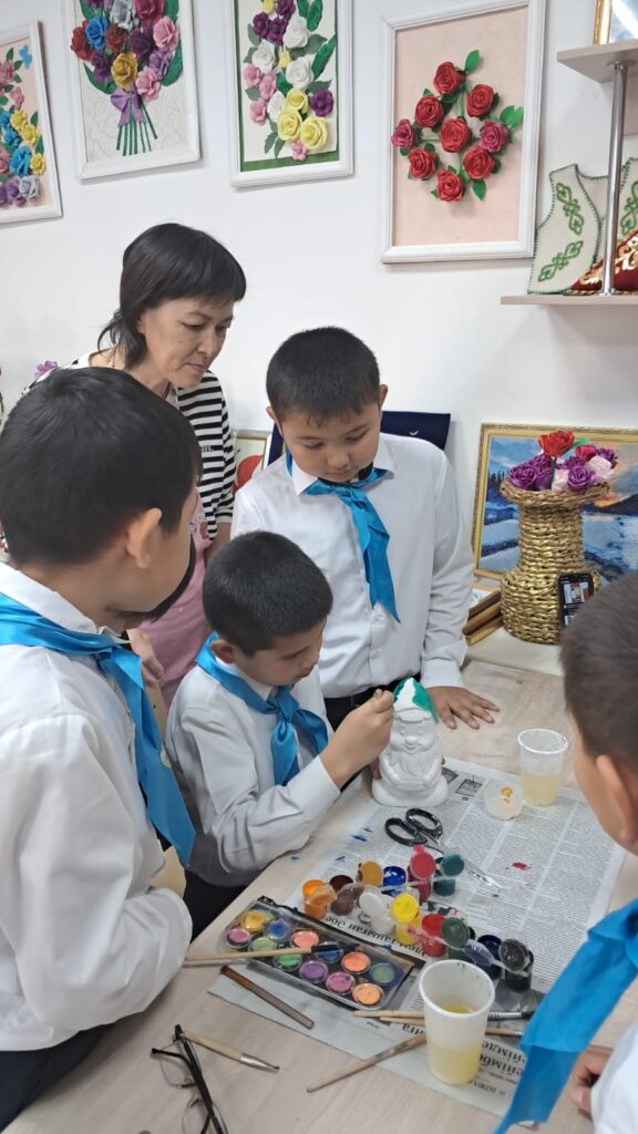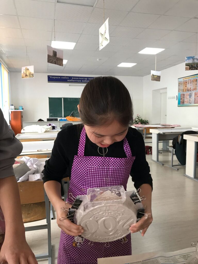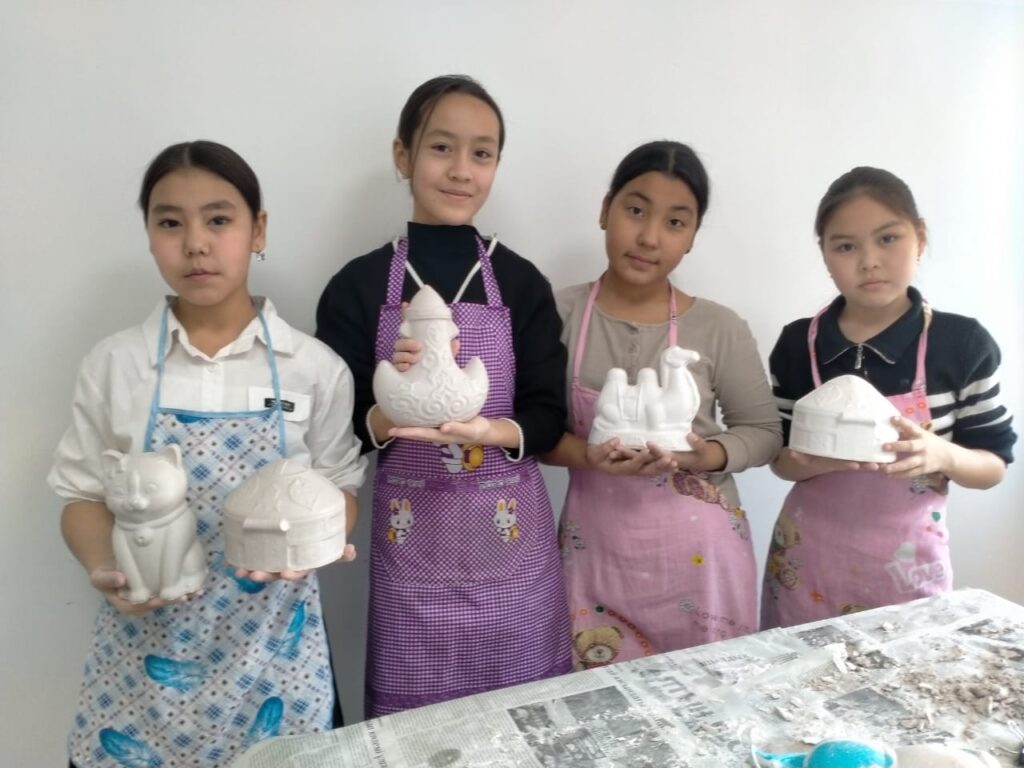 Технология пәні мұғалімдерінің жетекшілігімен 7–8-сынып оқушылары арасында гипспен жұмыс жасау ісі жолға қойылды. Оқушылар гипсті еріту, қалыпқа құю және қажетті пішіндерді жасау әдістерін меңгеріп, өз қолдарымен түрлі бұйымдар дайындауды үйренді. Нәтижесінде ат бейнесі, торсық, сандық, шырша, асық, қоян, киіз үй, қобдиша, бүркіт сынды ұлттық және тұрмыстық сипаттағы мүсіндер мен ойыншықтар дүниеге келді.