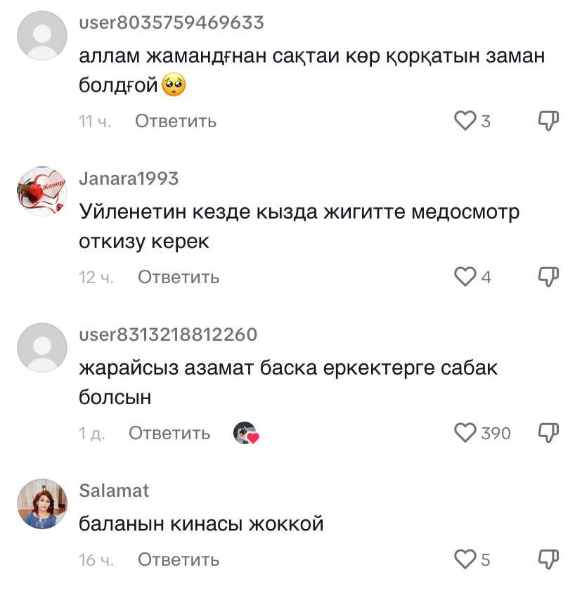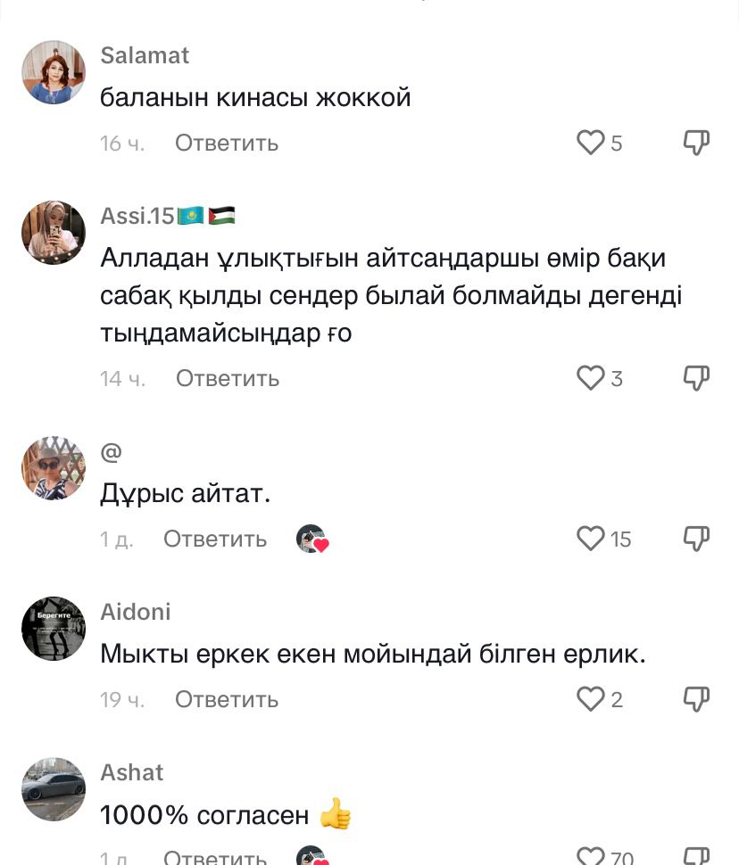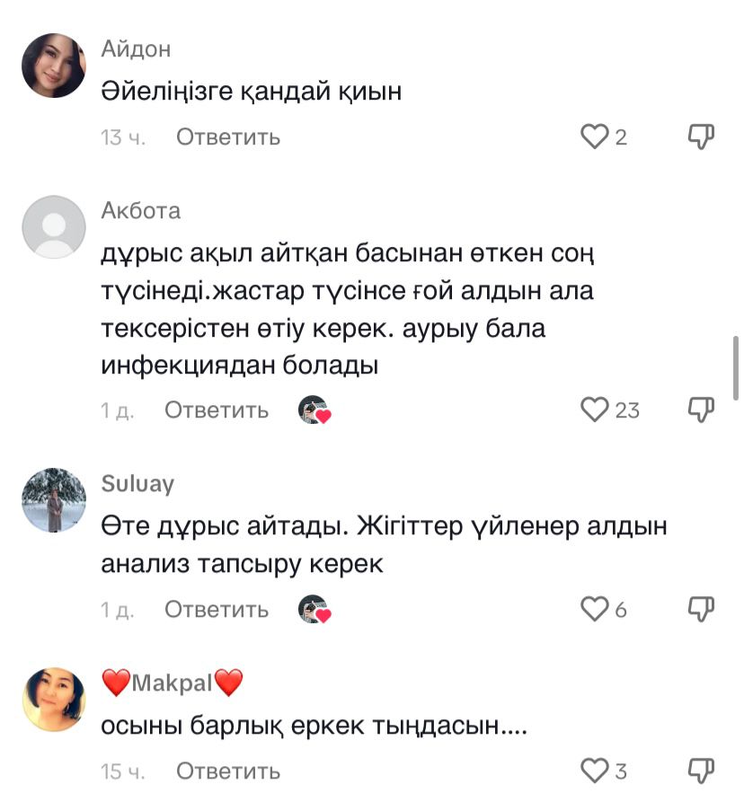 "Жарайсыз, азамат. Басқа еркектерге сабақ болсын", "Мықты еркек, мойындай білген ерлік", "Осыны барлық еркек тыңдасын", " Өте дұрыс айтады. Жігіттер үйленер алдын анализ тапсыру керек", — деп жазды олар.