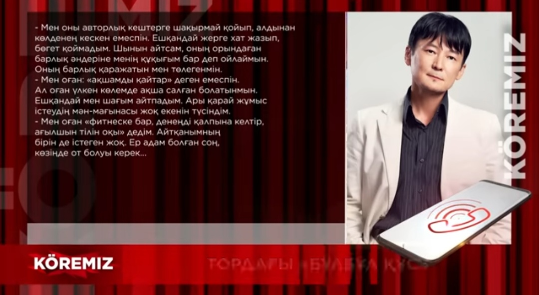 — Кешке шақырмай қойып, алдынан көлденең тұрған емеспін. Ешқандай жерге хат жазып, запрет қоям деген емеспін. Өйткені, оның әндерінің барлық қаражатын мен төледім. Мен оған ешқандай ақшамды қайтар демедім. Оған едәуір ақша салынды. Әжептәуір сома. Дұрысын түсіндім, ары қарай жұмыс істеудің мәнісі жоқ, мағынасы жоқ екенін. Мен оның бүкіл шығындарын төледім. Фитнеске барып, денеңді жаттықтыр, сымбатты бол. Ағылшын тілін оқы. Ер адам болған соң, көзінде от болып тұруы керек сахнада, дейді продюсер.