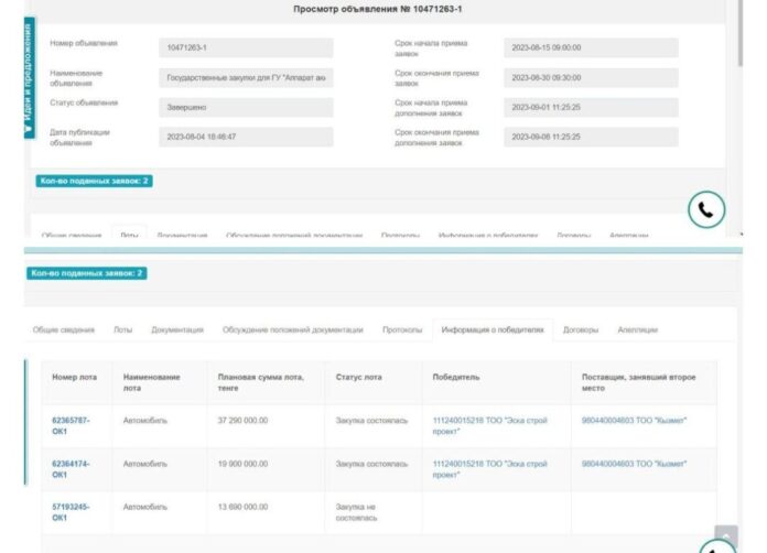 Мемлекеттік сатып алу порталындағы мәліметке сүйенсек, әкімдік аппараты алғашында шамамен 70,9 млн теңгеге (70 880 000 тг) үш автокөлік сатып алуды жоспарлап, лот жариялаған. Алайда тек оның екеуі бойынша конкурс ойнатылып, жеңімпаз ретінде бір компания анықталған. Оның бірі 37 290 000 теңгенің көлігі болса, екіншісі 19 900 000 теңге тұратын автомобиль, деп хабарлайды Caravan.kz медиа-порталы .otyrar.kz сайтына сілтеме жасап.