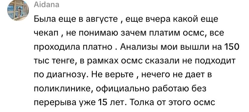 «МӘМС не үшін төлейтінімізді білмеймін, барлығын ақылы өттім. Анализдерім 150 мың теңге болды. МӘМС бойынша болмайды деді».