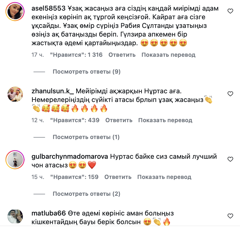 «Баяғыда немерелерін көріп, әжем айтушы еді, өөй тұқымың көбейгірлер деп, сол айтпақшы, немерелер көбейген сайын, Аллаға шүкіршілік айтумен жүрмін. Көз тимесін, амандықтарымен қуандыра берсін!», — деп жазды ол.