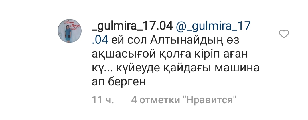 Ал көпшілік бұған түрліше ой айтты: "Ей, сол Алтынайдың өз ақшасығой қолға кіріп аған кү… күйеуде қайдағы машина ап берген", Алекең дұрыс айтады Алтынай ханым! Бес күндік өмірде күліп жайнап өмір сүру керек. Қайта айтсын, тағы да айта түссін! Бақытты болыңыздар! Бізге де жұғысты болсын! Аумин!", "Жааан деп созып айту дұрыс емес, ол жынның аты.Ренжімеңіз", "Ақ тұлпар құтты болсын!", деп жазды оқырмандар.