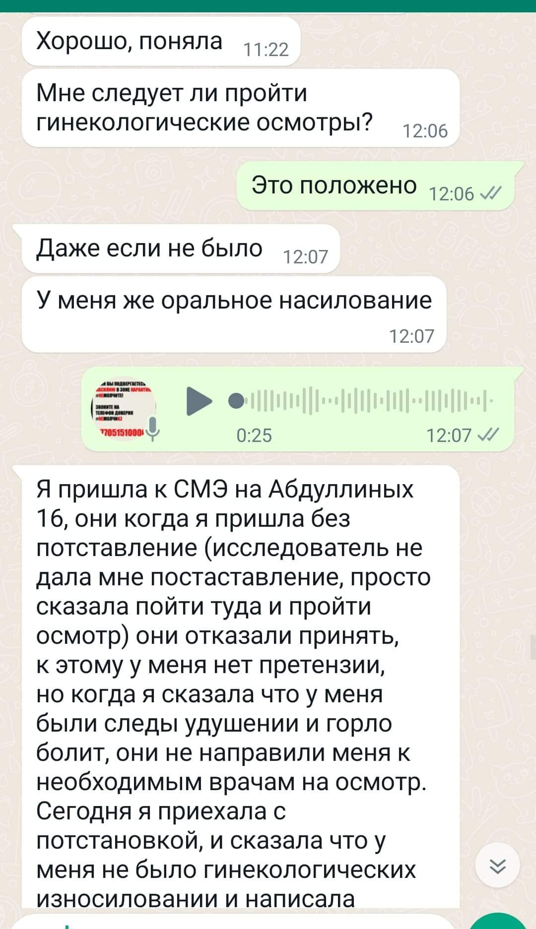 Маған қылмыстық іс қозғасаң, мына қыздарды қолдаудан айырасыз. Полиция зорлаушының мүддесі үшін жұмыс істеп жатқандай әсер қалдырады, бірақ шын мәнінде бұл немқұрайлылық, біліксіздік және зорлық-зомбылықтан аман қалғандарға қарапайым жанашырлықтың жоқтығы.