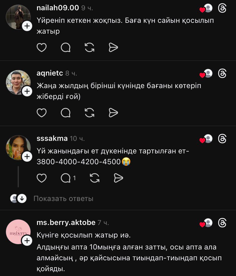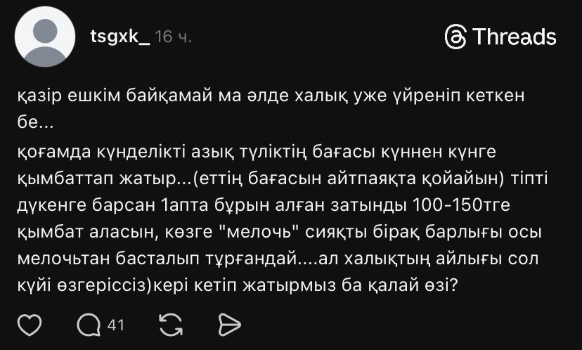 Кәсіпкерлер қиындықтан шығудың жолын іздеп жатқанда, қарапайым халық бағаның тұрақтанғанын байқамай отыр. Керісінше, әлеуметтік желілерде азық-түлік бағасының күрт өскені жиі айтылуда.