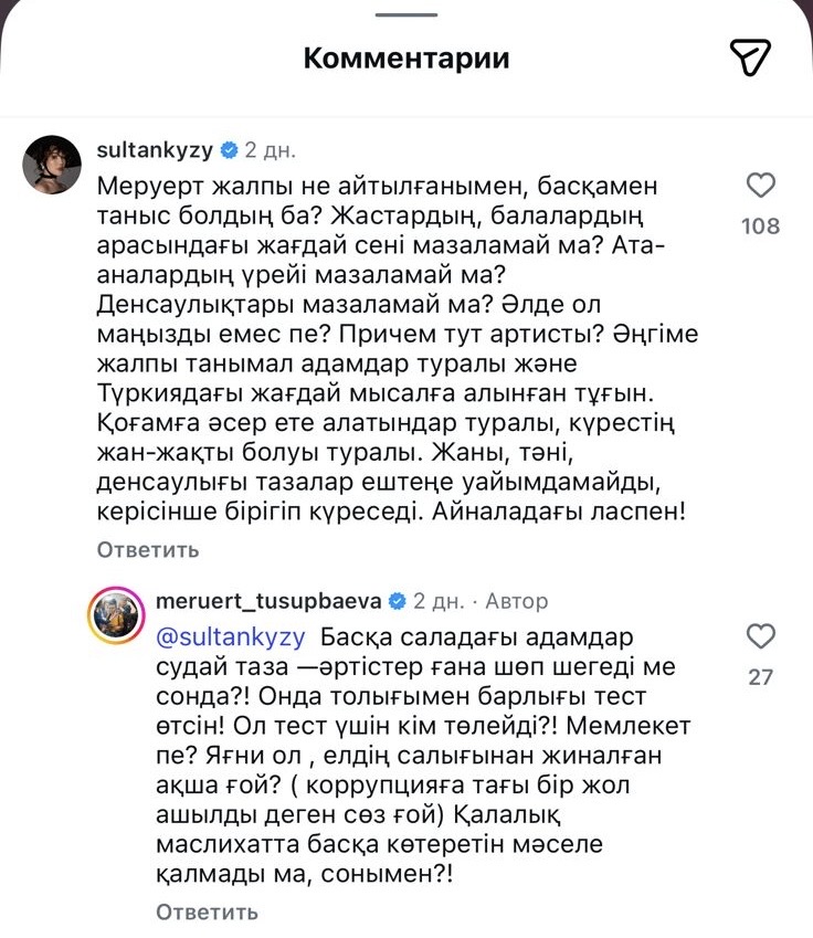 Меруерт Түсіпбаева Сұлтанқызының бұл пікірін жауапсыз қалдырмады.