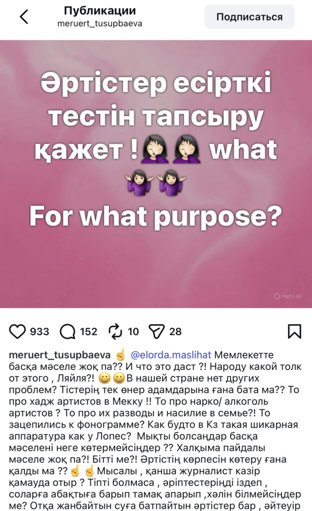 ”Мемлекетте басқа мәселе жоқ па? Халыққа бұдан не пайда, Ләйлә? Біздің елде басқа мәселе жоқ па? Тістерің тек өнер адамдарына ғана бата ма? Біресе Меккеге барған өнер адамдарына, біресе ажырасқан әртістерге, енді олардың есірткі қабылдауын тексеру қалды ма? Мықты болсаңдар басқа мәселені неге көтермейсіңдер? Халқыма пайдалы мәселе жоқ па? Бітті ме? Әртістің көрпесін көтеру ғана қалды ма”, — деп жазды әнші.