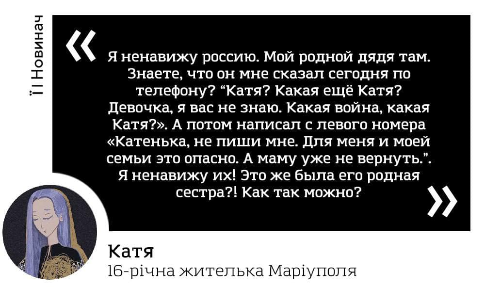 Мен Ресейді жек көремін, туыс ағам сонда тұрады. Бүгін телефонда маған оның не айтқанын білесің бе? «Катя? Қайдағы Катя? Мен сені танымаймын. Қандай соғыс, қандай Катя?