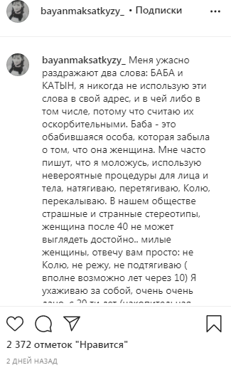 "Мен Баян Мақсатқызы Алагузова (қазақшасы Алакөзова болар) ханымды өнер өлкесіндегі іскерлігі, талай таланттардың бағын ашқан продюсерлік таланты үшін қатты сыйлайтынмын. Бүгін оның төмендегідей «Меня ужасно раздражают два слова — БАБА и ҚАТЫН. Я никогда не использую их ни в свой адрес, ни в чей-либо еще, потому что считаю их оскорбительными." деген пікірін оқып еріксіз ойға қалдым. Баба дегеніне әрине біздің қатысымыз жоқ. Ал ҚАТЫН сөзі біздің бабаларымыздың мұрасы. Оны жоққа шығаруға, ревизиялауға ешкімнің де құқы жоқ! Алдымен ҚАТЫН сөзінің мейрімді мағынасын түсініп алған жөн. Күллі түркі тілдес халықтар сүйікті жарын қатын дейді. Тек сонау жылдардағы шолақ белсенділердің "қатын деген тек байлар айтатын қатқыл сөз" деген сауатсыз пәлсапасынан кейін қазақ пен қырғыз ғана "әйел, айал" деп шатасып кетті", деді Қалыбек Атжан.