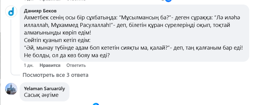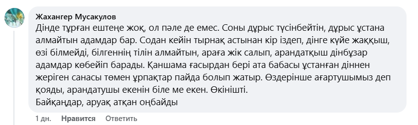 Бұл дін деген пәле ат төбеліндей аз Қазақтың санасын улап, жік- жікке бөліп, қараңғылыққа батырып құртатын болды-ау», — деп жазды кәсіпкер.