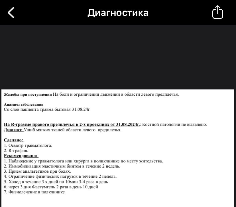 2024 жылғы 31 тамызда ол тұрмыстық жарақат бойынша медициналық мекемеге жүгінді деп көрсетілген. «Диагностика» бөлімінде сол жақ білектің екі проекцияда рентген түсірілімі жасалғаны жазылған. Диагноз ретінде сол білектің жұмсақ тіндерінің жарақаты көрсетілген.