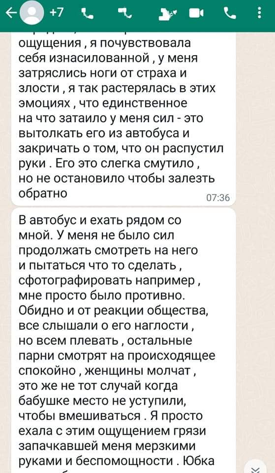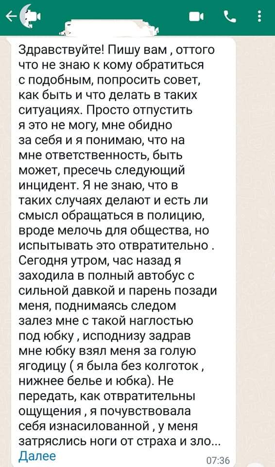 — Сәлеметсіз бе! Мен бұл жағдайда кімге жүгінерімді білмеймін. Мұндай жағдайда қалай және не істеу керектігі туралы кеңес сұраймын. Мен үшін қиын жағдай. Бұл жайлы айтпай қалуым дұрыс емес, мүмкін де емес. Мұндай оқиғада не істейтінін және полицияға барудың мағынасы бар ма, білмеймін, бұл қоғам үшін ұсақ-түйек сияқты көрінеді, бірақ оны бастан кешіру жиіркенішті. Бүгін таңертең, бір сағат бір бұрын автобусқа отырдым. Артымда тұрған бір жігіт етегімді жоғары көтеріп, жалаңаш жамбасымнан ұстап, сиспады. (Мен колготкисіз, іш киімде юбкада бодым). Сол кездің қаншалықты жиіркенішті екенін айтып жеткізе алмаймын, өзімді зорлағандай сезіндім, аяғым қорқыныш пен зұлымдықтан дірілдеп кетті. Абдырап қалғаным сонша, қолымнан келгені, бар күшіммен оны итеріп жіберіп, айқайладым. Ол ұялған да жоқ. Оған бірдеңе істеуге, суретке түсіретіндей күйде емес едім. Жиіркенішті сезімде болдым. Айналамдағылар бәрі естіп, көріп тұр. Ешкімнің де шаруасы жоқ. Ер адамдар да, әйелдер де былқ етпеді.