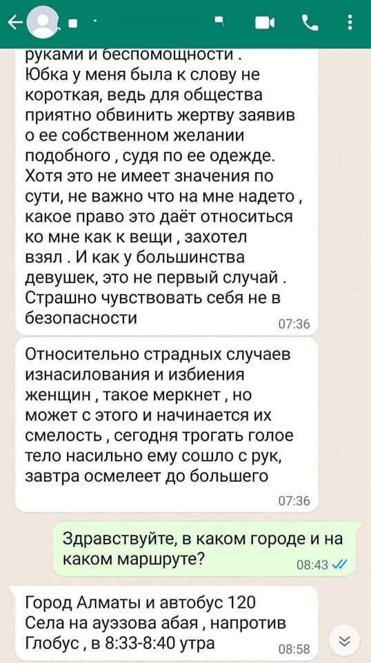 Айтпақшы, менің киімім қысқа болған жоқ. Біздің қоғамда киіміне қарап, өзі соған ыңғай берді деген түсінік қалыптасқан. Бәрі тек кінәлауды біледі. Қандай киім кисем де маған зат сияқты қарап, бұлай қорлауға қандай құқығы бар? Соны білгім келеді. Бұл тек менің ғана басымнан өткен бірінші жағдай емес. Көп қыздардың басынан өтіп жатқан нәрсе. Өзіңді қауіпті жағдайда және қорқынышта сезіну сондай қиын. Бүгін етегімді түріп, жамбасымды сипаса, ертең одан зорғысына барады.