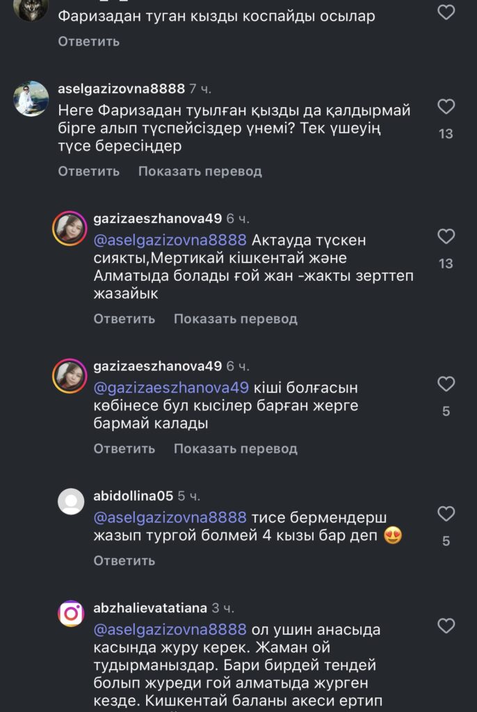 “Неге Фаризадан туған қызды да қалдырмай бірге алып түспейсіздер? Үнемеі тек үшеуің түсе бересіңдер”, “Осылар Фаризадан туған қызды қатарларына қоспайды”, “Осылар үшеуі бөлектеніп жүреді екен”, — деп жазды олар.