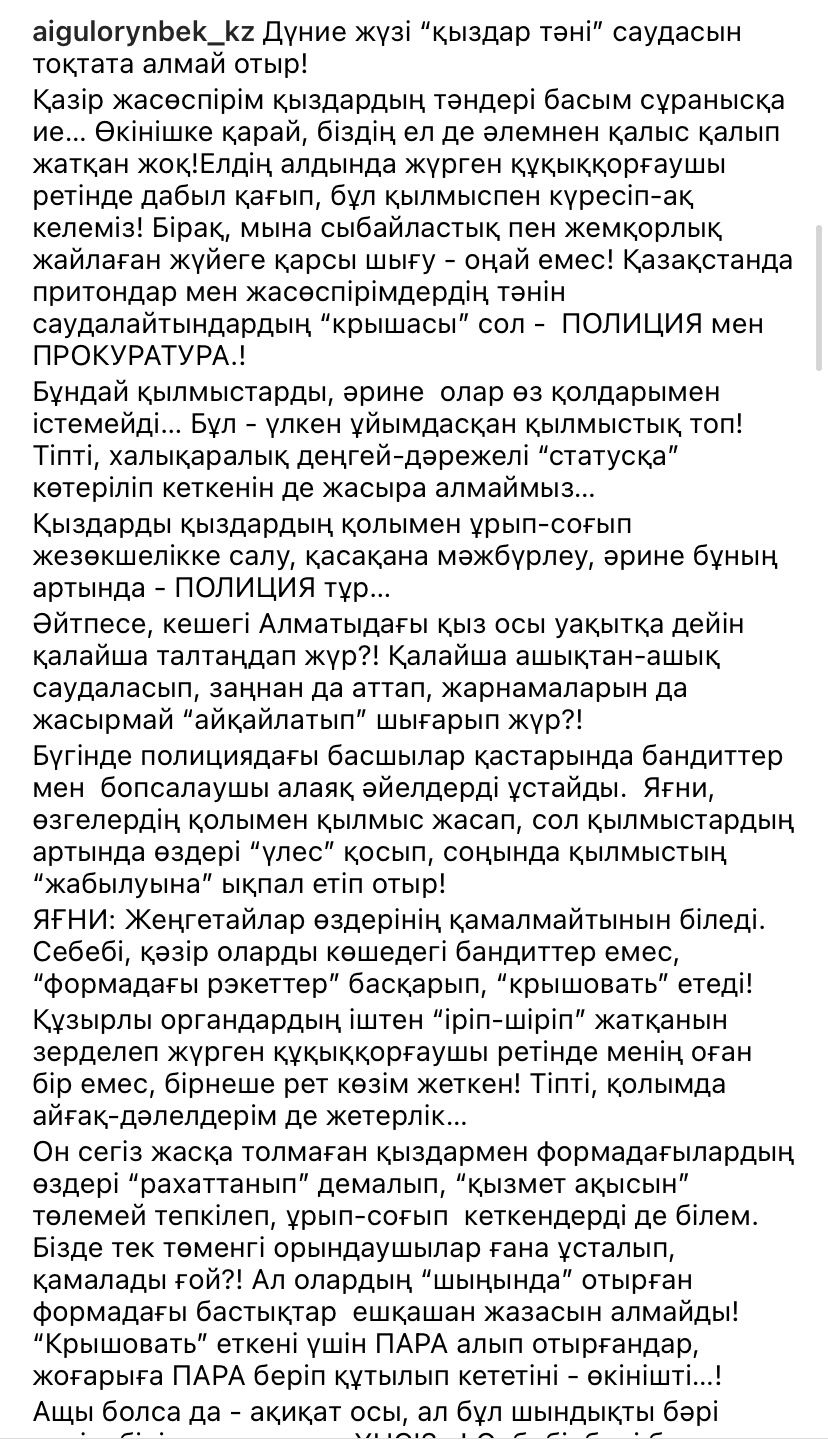 Қазір жасөспірім қыздардың тәндері басым сұранысқа ие. Өкінішке қарай, біздің ел де әлемнен қалыс қалып жатқан жоқ.  Елдің алдында жүрген құқыққорғаушы ретінде дабыл қағып, бұл қылмыспен күресіп-ақ келеміз. Бірақ, мына сыбайластық пен жемқорлық жайлаған жүйеге қарсы шығу — оңай емес! Қазақстанда притондар мен жасөспірімдердің тәнін саудалайтындардың "крышасы" сол — Полиция мен Прокуратура!