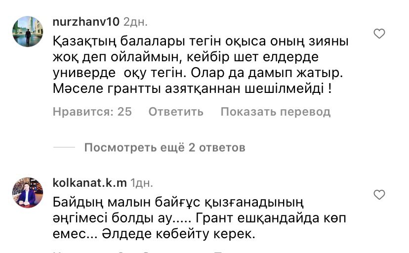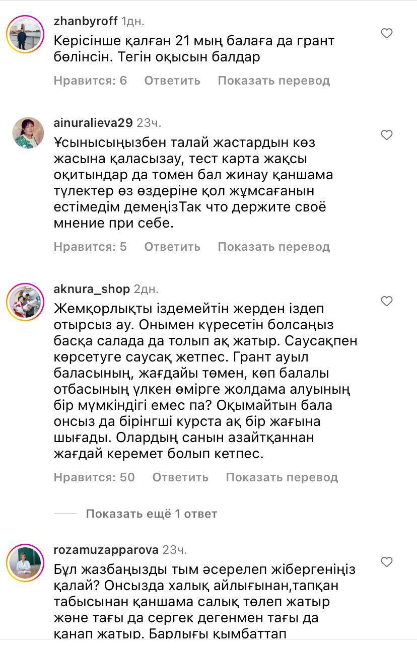 "Керісінше қалған 21 мың балаға да грант бөлінсін. Тегін оқысын балалар. "Байдың малын байғұс қызғанады әңгімесі болды-ау. Грант ешқандай да көп емес. Әлде де көбейту керек. "Қазақтың балдары тегін оқыса оның зияны жоқ деп ойлаймын", — деп жазды олар.