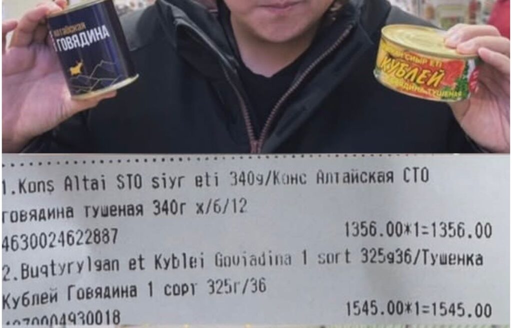 Келесі мысал — консервіленген ет. Ақтау гипермаркетінде сатылып жатқан қазақстандық ет консервісі 1545 теңге тұрады. Бұл өнім Орал қаласындағы зауытта өндірілген. Ал Ресейдің Новосібір қаласында шығарылған ет консервісі — 1356 теңге. Баға айырмасы — 189 теңге.