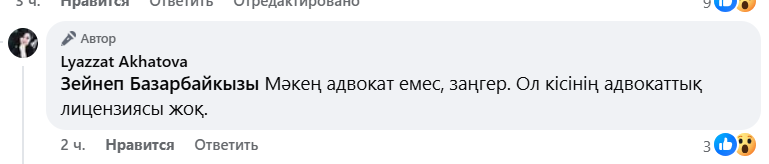«Мына жігіт кәсіби маман сияқты. Негізі қылмыстық істерге адвокатық лицензиясы жоқ, тек азаматтық істерде тәжірибе жинаған заңгерлер емес, мықты адвокаттар қатысу керек. Алдындағы тергеуде тер төккен адвокаттары қайда кетті? Өз басым жәбірленуші тараптың қорғаушыларынан Бағдагүл ханымды өз ісінің мықты маманы деп білем. Алайда біреудің қайғысын пайдаланып, өз атын шығару үшін әріптестеріне қиянат жасайтын әріптестерді еш түсіне алмайды екем..Өз басымнан да өтті, ондай қиянаттар», — деді Ләззат Ахатова.