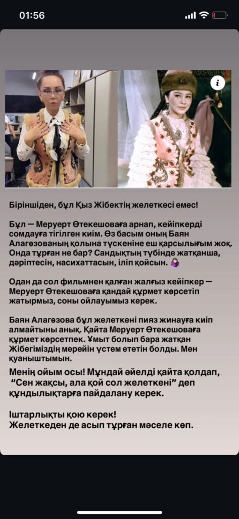 «Біріншіден, бұл Қыз Жібектің желеткісі емес! Бұл Меруерт Өтекешоваға арнап, кейіпкерді сомдауға тігілген киім. Өз басым оның Баян Алагөзованың қолына түскеніне еш қарсылығым жоқ. Онда тұрған не бар? Сандықтың түбінде жатқанша, дәріптесін, насихаттасын, іліп қойсын!