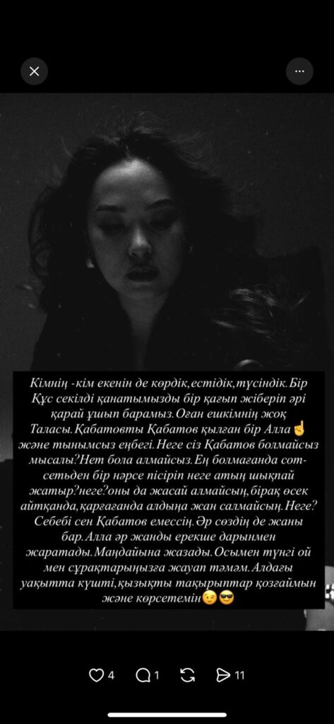 Әлемде жалғыз Тұрсынбек ажырасып па? Қай баласын далаға тастапты? Қай баласын қараусыз, аш қалдырыпты? Сіздер талқылайтын әңгіме емес. Жеке өмір сол үшін жеке деп аталады. Қабатов деген брендтің құлағанын күтіп жүрген жандар көпсіздер. Бірақ Алланың басына берген бағын, таңдайына берген өнерін ешкім де, ешқашан да тартып ала алмайды», — деп жазды ол.