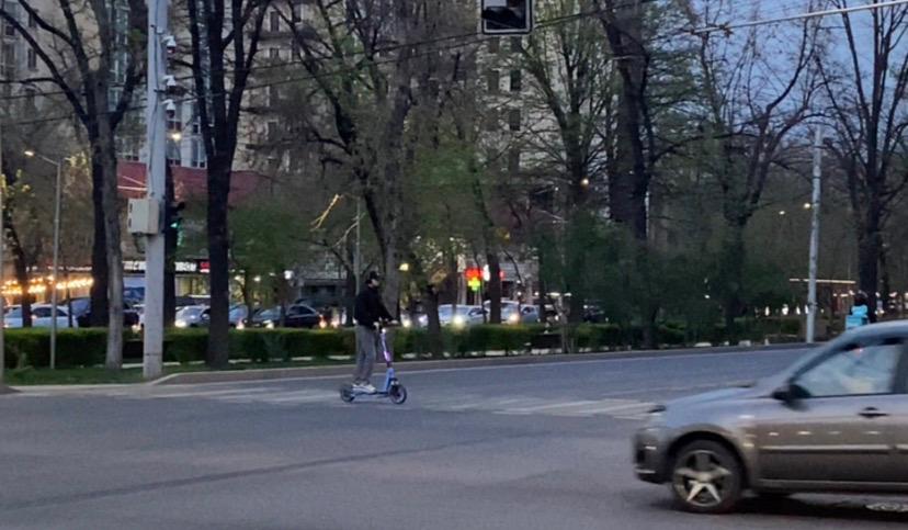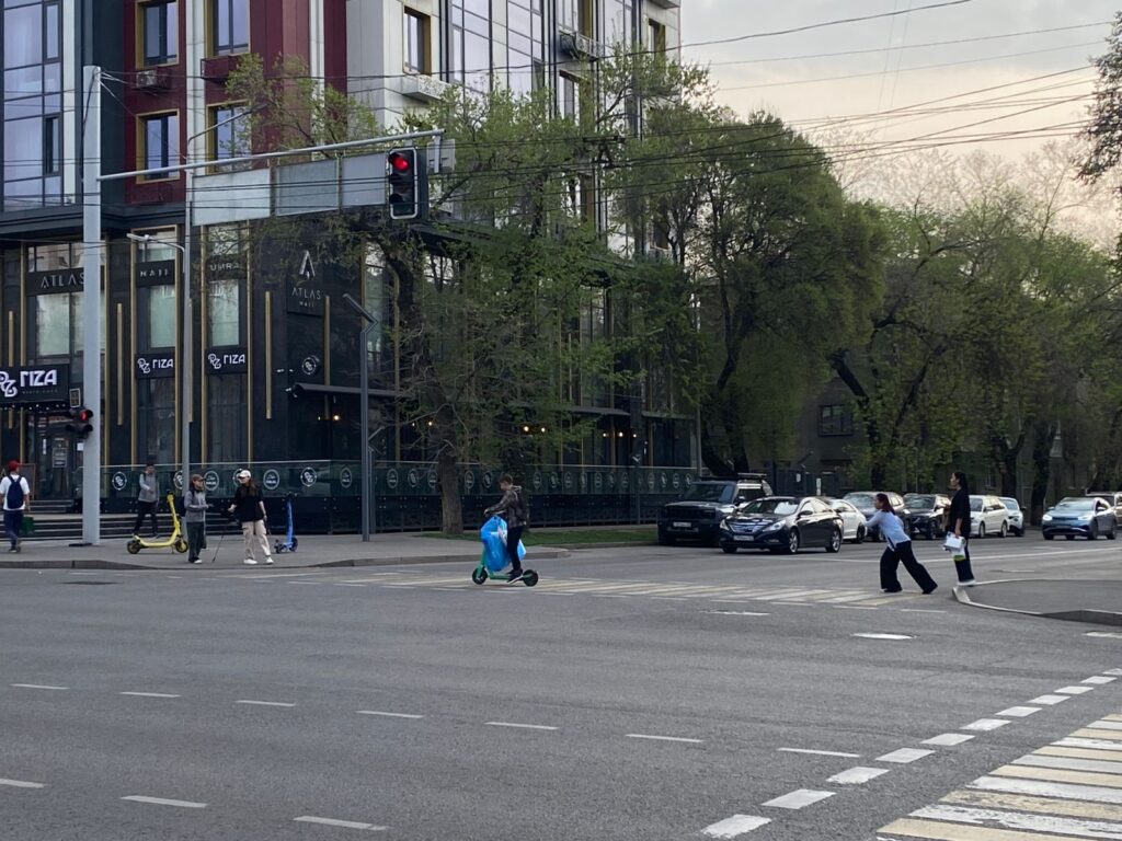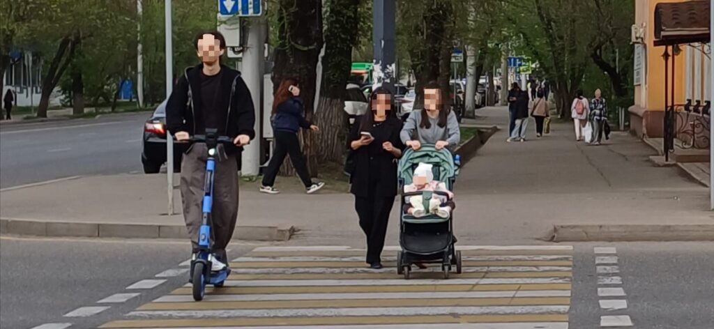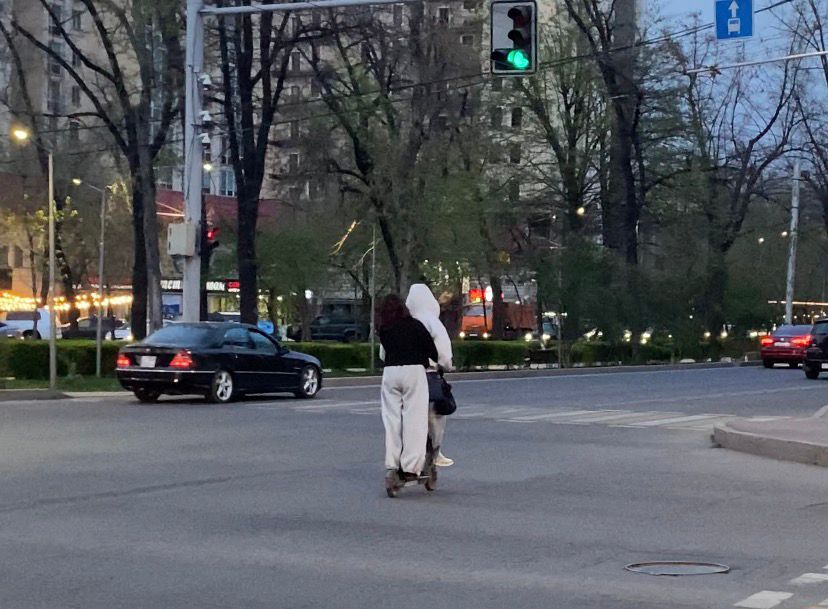 Жасыл бағдаршамда, жаяу жүргіншілер өткелінде тоқтап, самокаттан түсудің орнына, жолды жылдамдықпен кесіп өтетіндер көп. Кейде тіпті диагональ бойынша өтетіндерді де байқадық.
