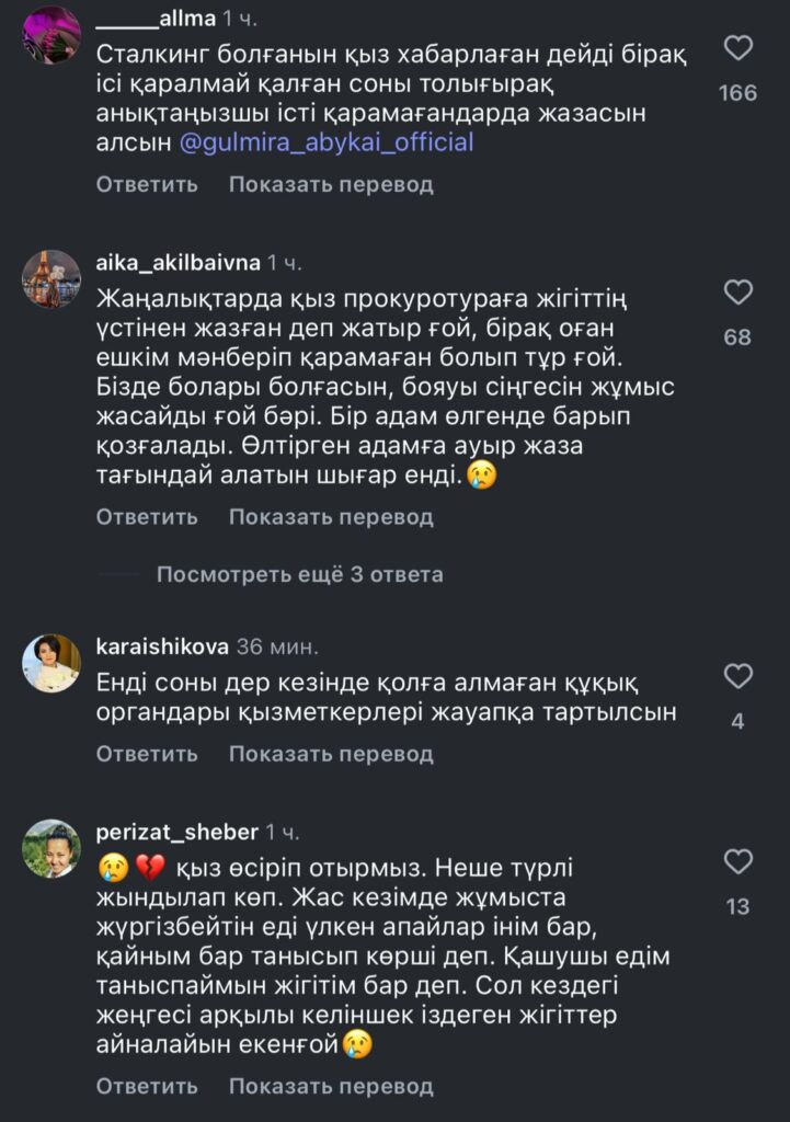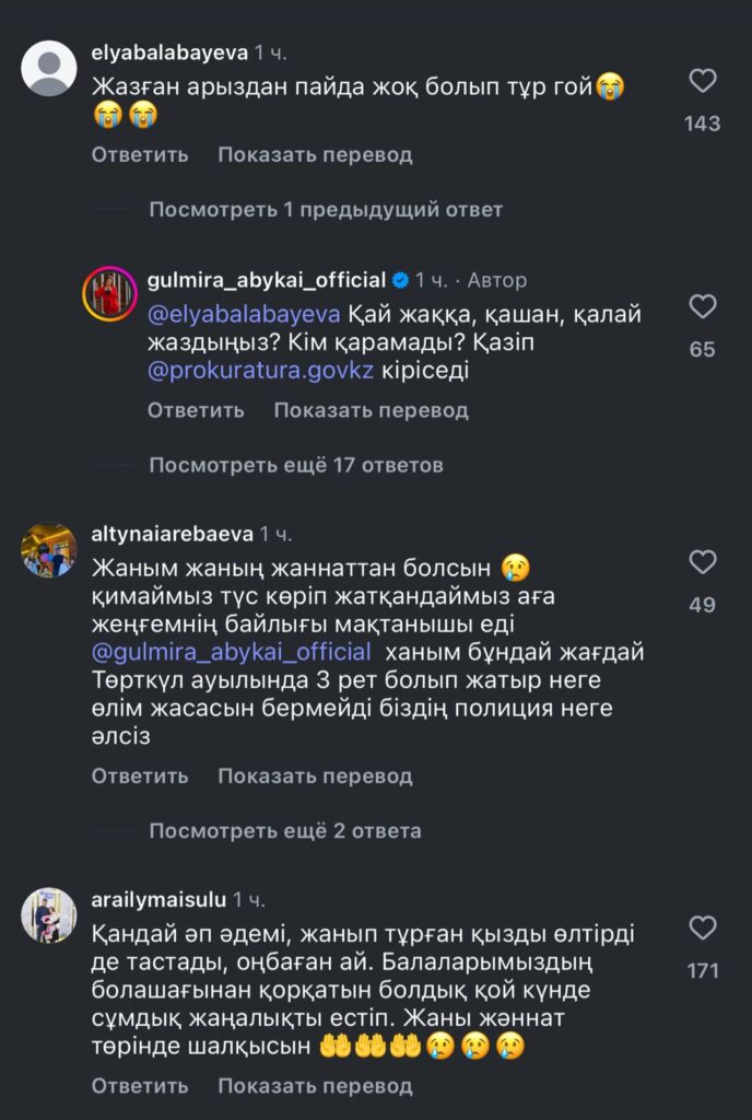 «Арыз қаралмаған ғой жазған,ешкім мән бермеген, полиция жұмыс жасамаған болып тұр ғой!», «Жаңалықтарда қыз прокуротураға жігіттің үстінен жазған деп жатыр ғой, бірақ оған ешкім мәнберіп қарамаған болып тұр ғой», «Қандай әп әдемі, жанып тұрған қызды өлтірді де тастады, оңбаған ай. Балаларымыздың болашағынан қорқатын болдық қой күнде сұмдық жаңалықты естіп. Жаны жәннат төрінде шалқысын», «Жазған арыздан пайда жоқ болып тұр ғой», «Қимаймыз, түс көріп жатқандаймыз. Бұндай жағдай Төрткүл ауылында 3 рет болып жатыр», — деп жазды олар.