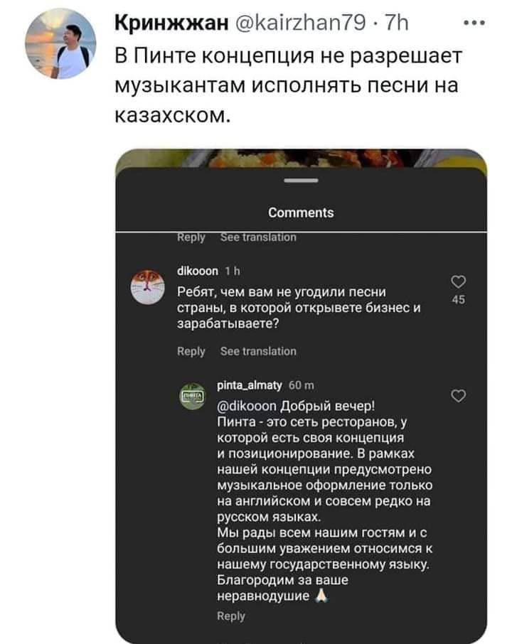 2023 жылы «Пинта» белгілі мейрамханалар желісі де қазақ тілін менсінбейтін болып шықты. Белгілі болғандай, бұл көңіл көтеру орындарында қазақ әндерін орындауға рұқсат жоқ екен. Мейрамхананың ресми парақшасының жауабына сүйенсек, қазақша әндердің ойнатылуы мекеменің тұжырымдасына сай келмейді-мыс.