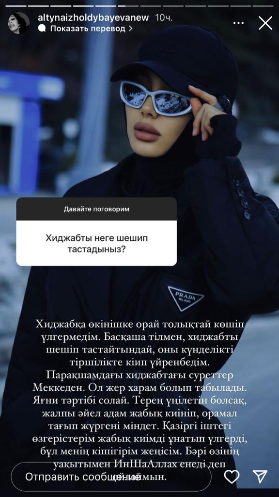 Айтуынша, хиджабқа әлі толық келіп үлгермеген. Мекке қаласында жүріп, сол жақтың тәртібіне сәйкес орамал таққан. Фотоларын желіге жүктегеннен кейін көпшілік оны "хиджабқа келді" деп топшылаған, деп хабарлайды Caravan.kz.