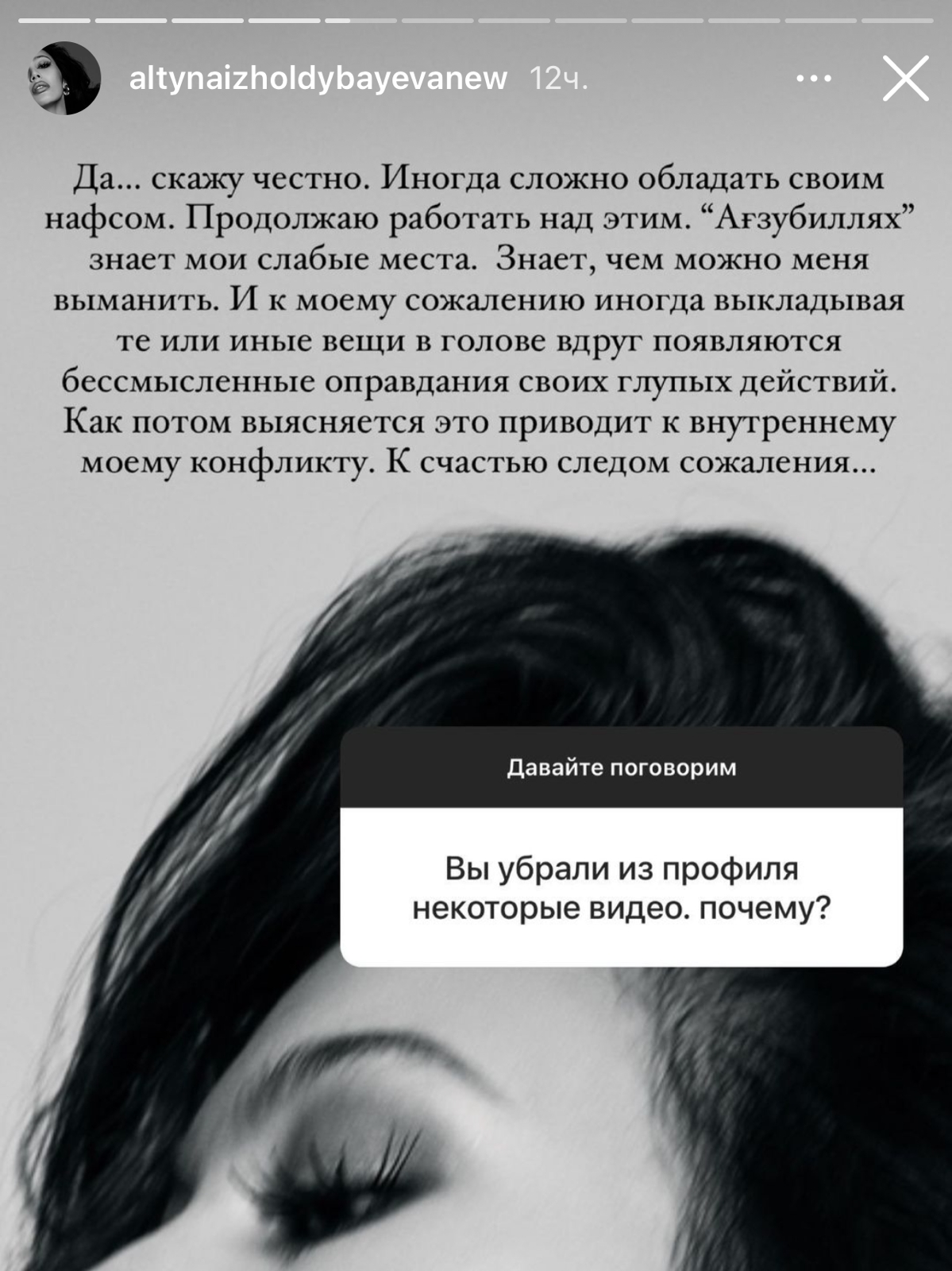 "Шынымды айтайын, кейде нәпсімді тиюым қиын. Онымен әрі қарай да жұмыс істей беремін. "Ағзубиллях" менің әлсіз тұстарымды біледі. Мені немен азғыру керектігін біледі. Кейбір дүниелерді жария еткеннен кейін ақымақ әрекеттерім үшін басыма неше түрлі ақталулар келеді. Сонан кейін іштей қарсылық пайда болады", — деген.
