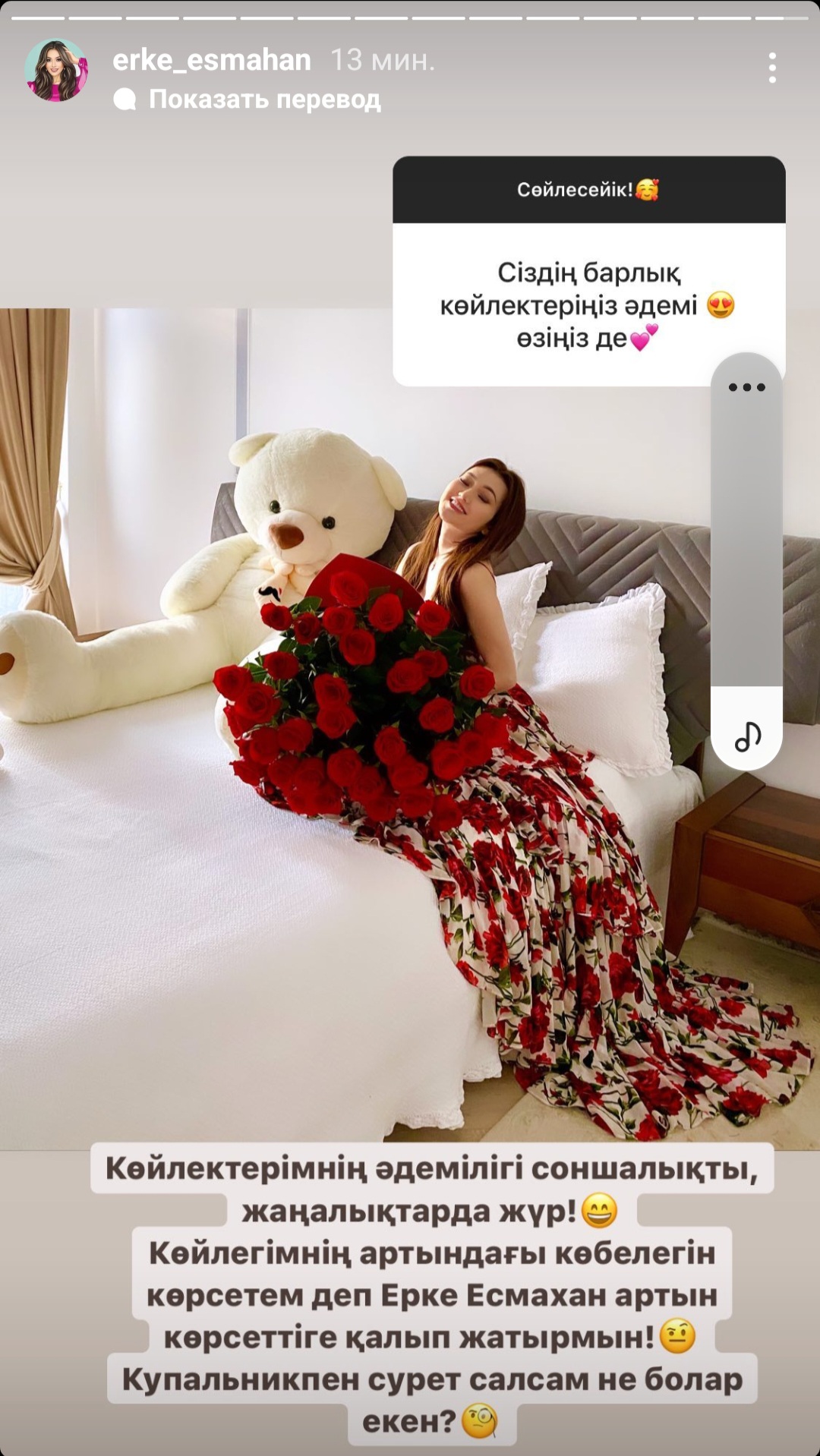 "Көйлектерімнің әдемлігі соншалық, жаңалықтарда жүр. Көйлегімнің артындағы көбелегін көрсетемін деп, Ерке Есмахан артын көрсеттіге қалып жатырмын. Купальникпен сурет салсам не болар екен? деп жазды инстаграмдағы сториз бөлімінде.
