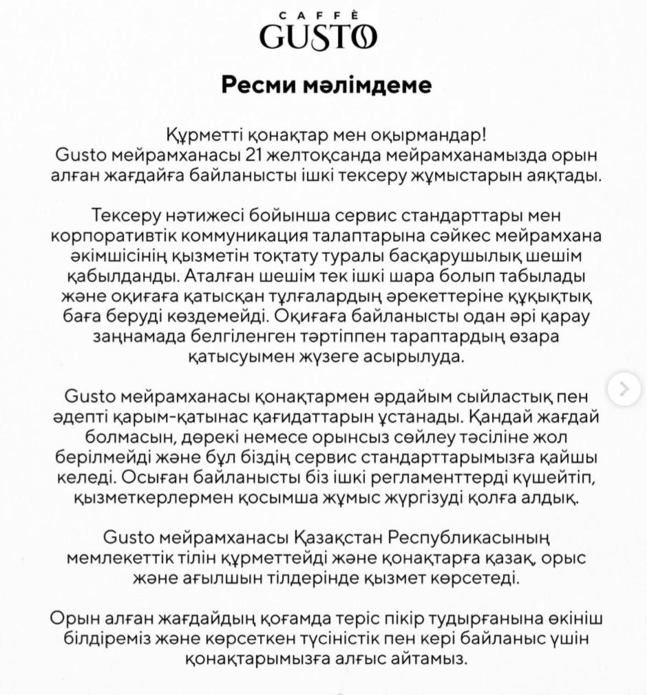 «Gusto мейрамханасы Қазақстан Республикасының заңдарын және мемлекеттік тілді құрметтейді. Біз қонақтарға қазақ, орыс және ағылшын тілдерінде қызмет көрсетеміз. Әлеуметтік желіде жарияланған бейнежазба мұқият зерттеуді талап етеді. Қазіргі таңда ішкі тексеру жүргізілуде. Оның нәтижесі шыққанға дейін егжей-тегжейлі пікір білдіруден бас тартамыз», – делінген хабарламада.