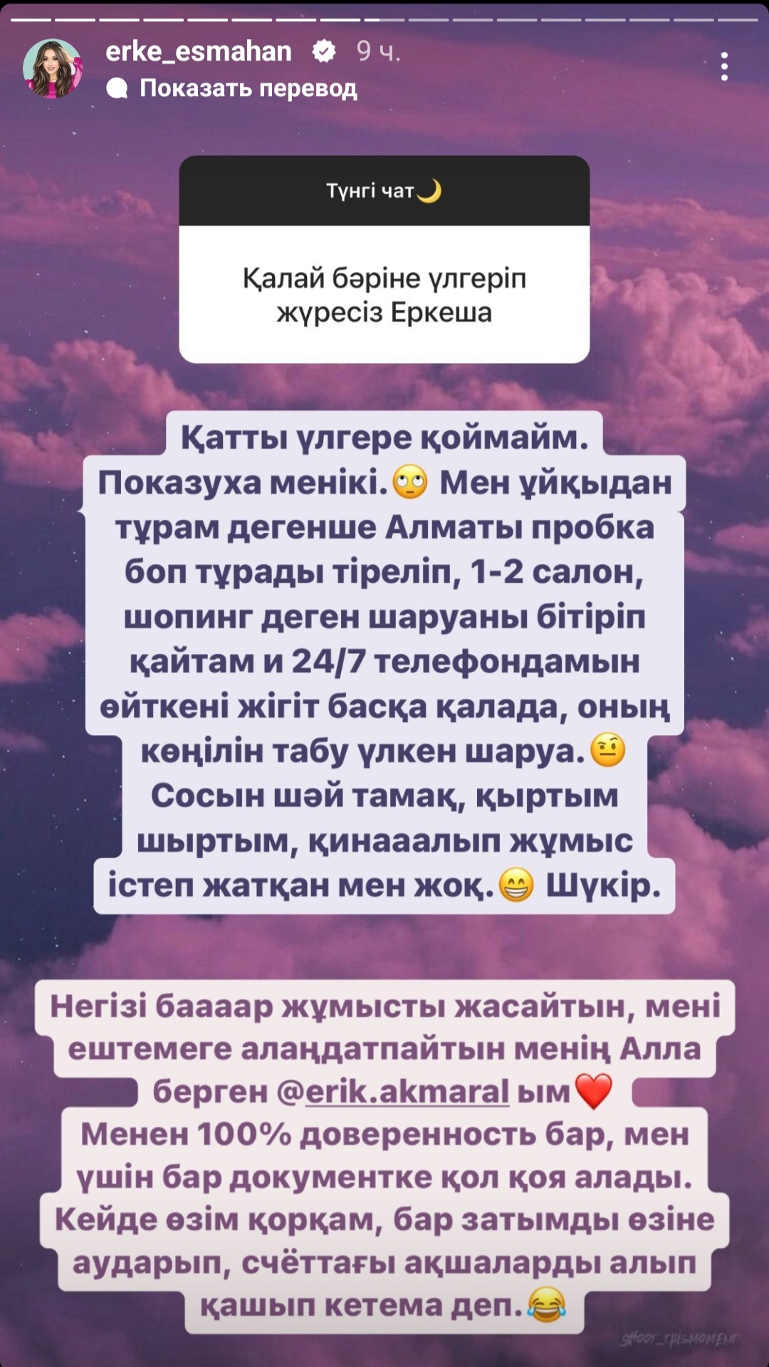 — Қатты үлгере қоймаймын. Показуха менікі. Мен ұйқыдан тұрамын дегенше, Алматыда кептеліс басталып кетеді. 1-2 салон, шоппинг деген шаруаны бітіремін. 24/7 телефондамын. Өйткені жігіт басқа қалада. Қатты үлгере қоймаймын. Шәй, тамақ деп қиналып жұмыс істеп жатқан мен жоқ, — деп жауап берді әнші.
