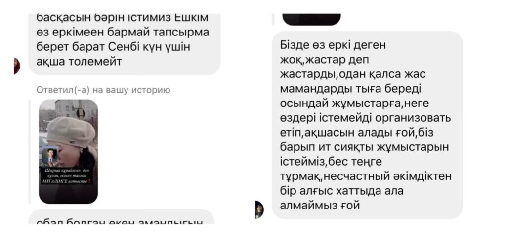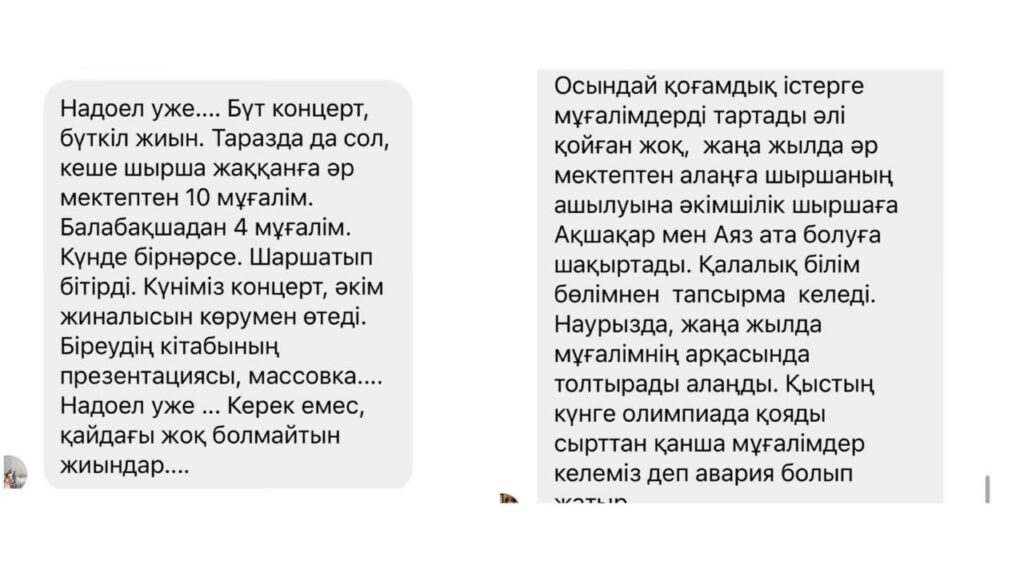 «Бізде өз еркімен деген жоқ. Жас мамандарды әр жерге тыға береді. Неге өздері істемейді? Ақшасын алады ғой. Біз ит сияқты жұмыстарын істейміз, бес теңге де төленбейді. Тіпті әкімнен алғыс хат та алмаймыз», — деп жарысып жазып жатыр ұстаздар қауымы.