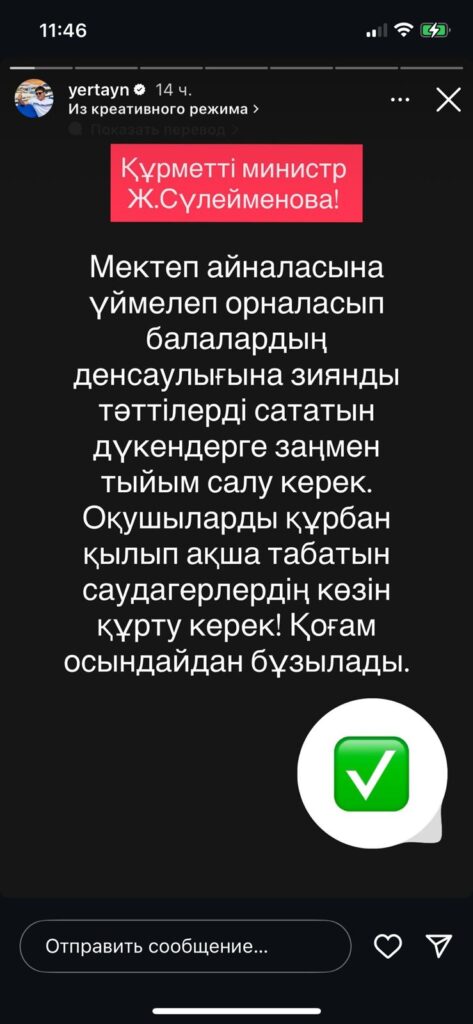 «Құрметті, министр Жұлдыз Сүлейменоваға! Мектеп айналасына үймелеп орналасып, балалардың денсаулығына зиянды тәттілерді сататын дүкендерге заңмен тыйым салу керек. Оқушыларды құрбан қылып, ақша табатын саудагерлердің көзін құрту керек! Қоғам осындайдан бұзылады.