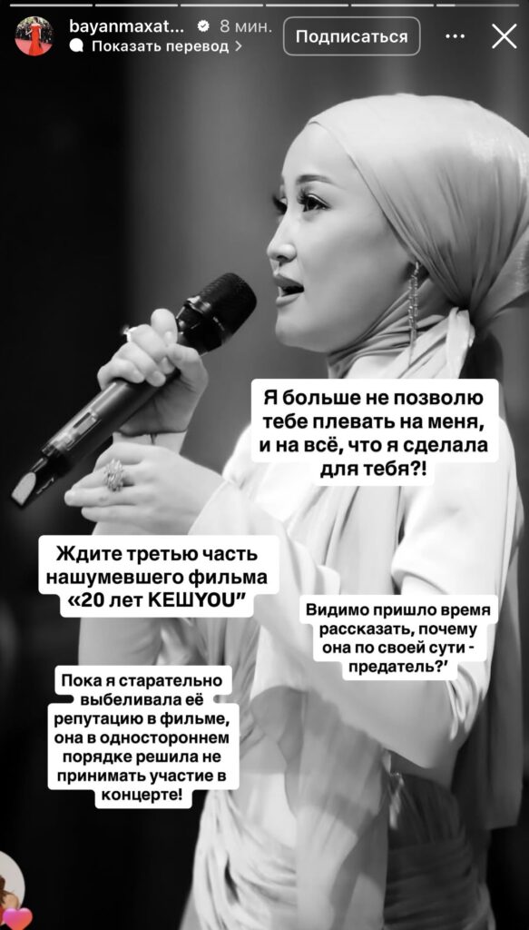 ”Сен үшін жасағанымның түкіруіңе енді жол бермеймін. КешYou 20 жылдық деректі фильмінің 3 бөлімін күтіңіздер! Мен фильмде оның беделін ақтап, барынша жақсы етіп көрсетуге тырысып жүргенімде, ол біржақты шешім қабылдап, концертке қатыспаймын деп шешіп шығарыпты. Оның қандай сатқын екенін айтатын уақыт келген сияқты”, — деді Алагөзова.