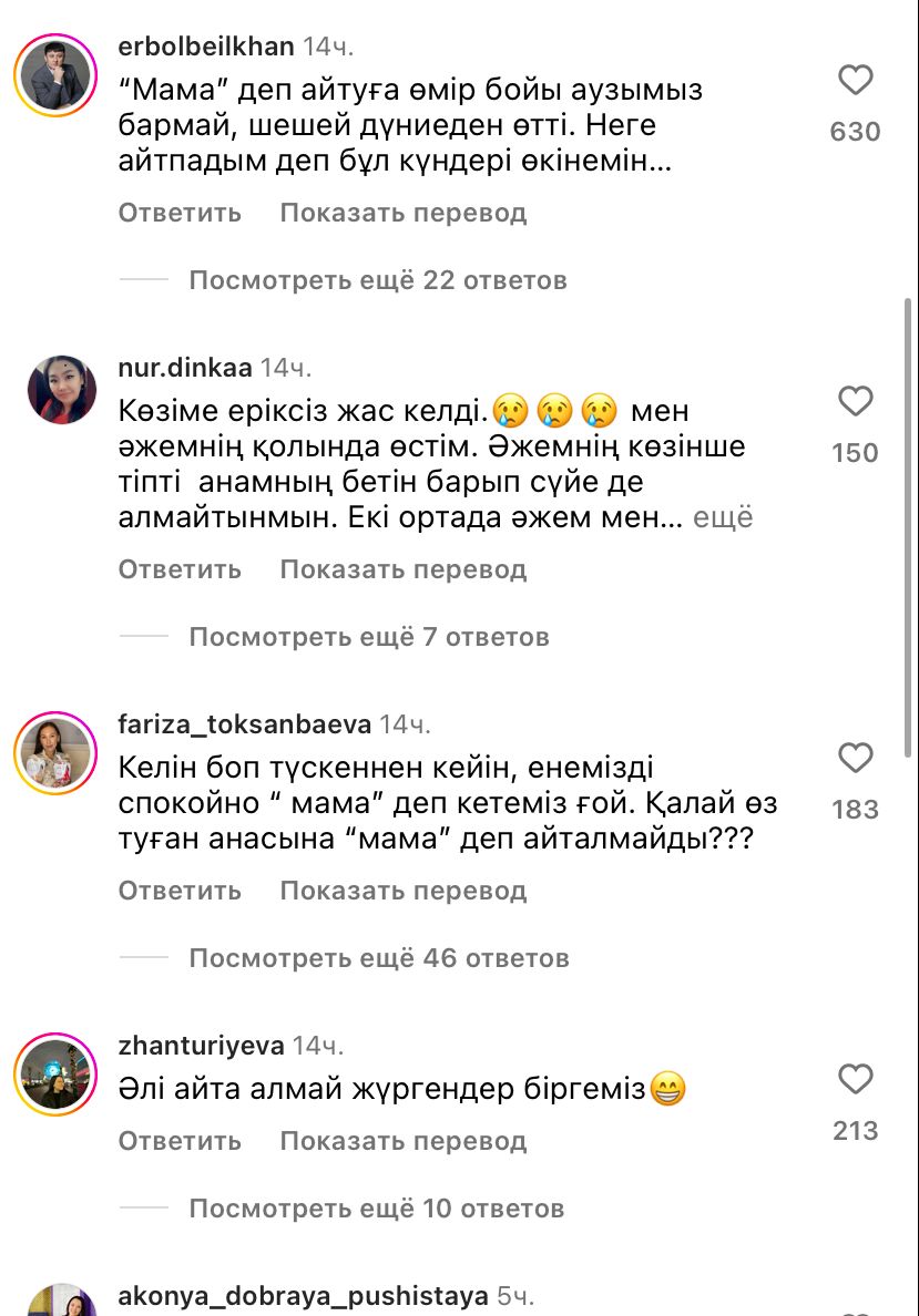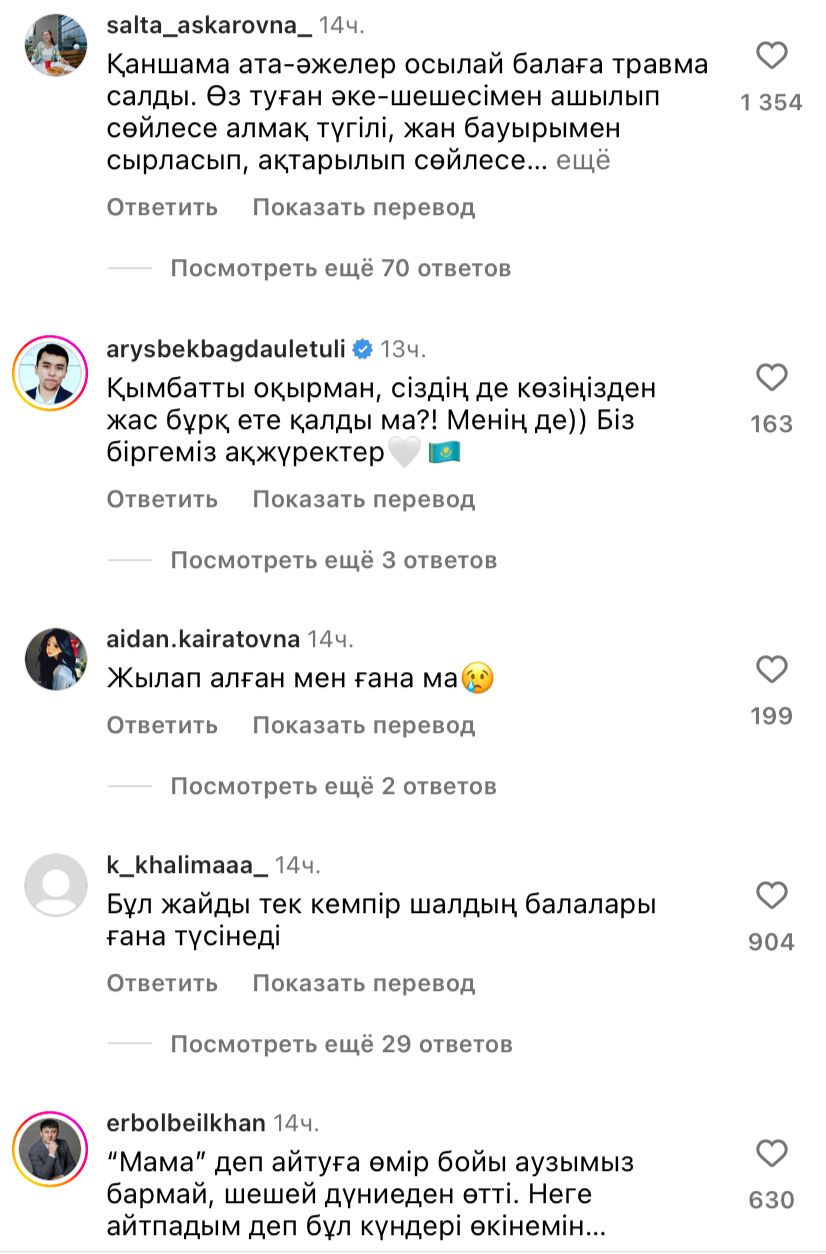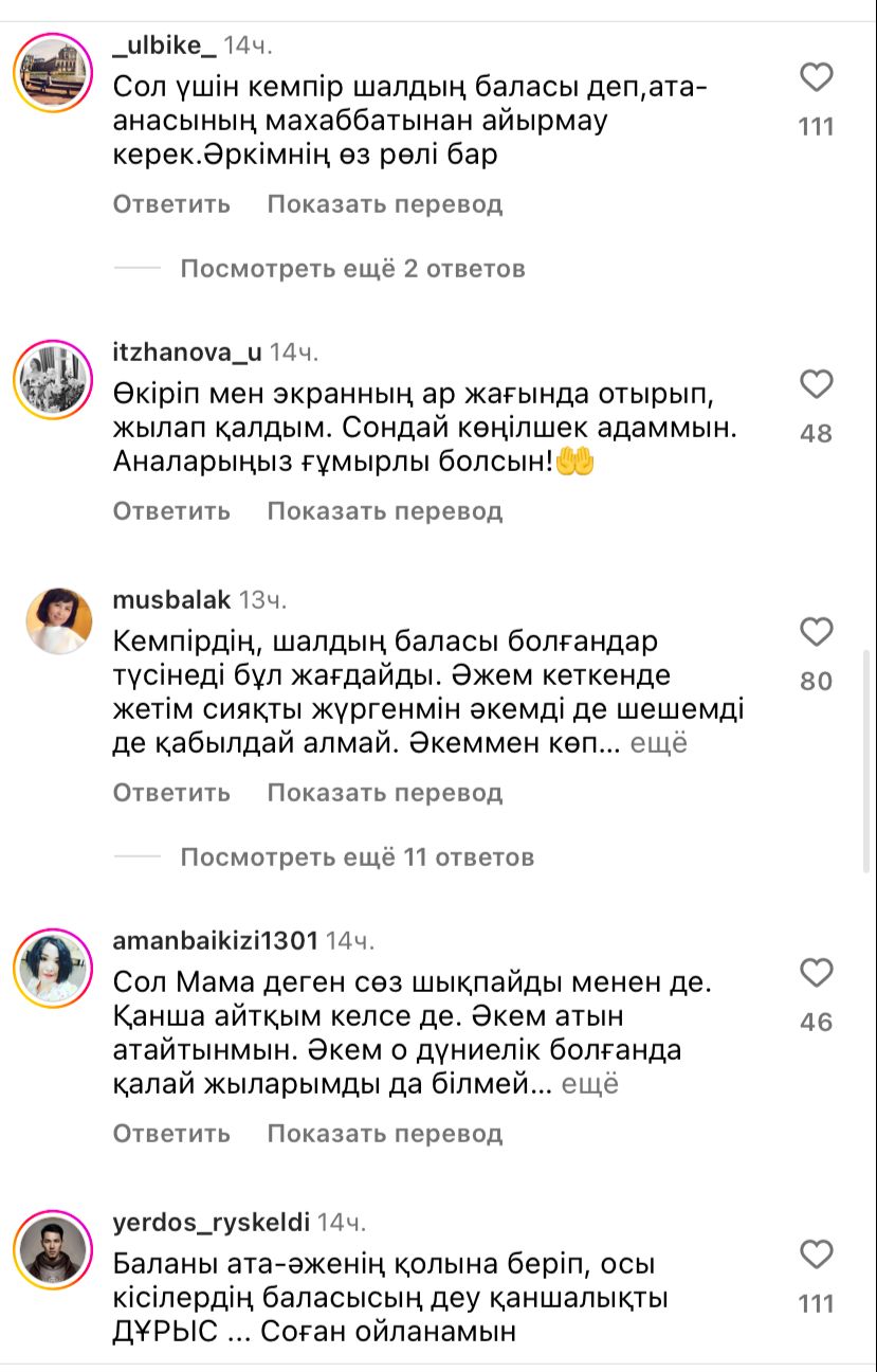 "Қаншама ата-әжелер осылай балаға травма салды. Осындай тәрбиенің түкке қажеті жоқ.", Бұл жайды тек кемпір шалдың балалары түсінеді", "Мама деп айтуға өмір бойы аузымыз бармай, шешей дүниеден өтті. Неге айтпадым бұд күндері өкінемін", "Сол үшін кемпір шалдың баласы деп ата-анасының махаббатынан айырмай керек. Әркімнің өз рөлі бар", — деп жазды олар.