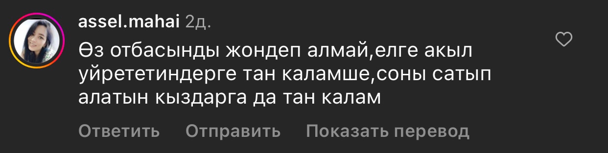Айта өтейік, продюсер Гүлзира Айдарбекованың кіші ұлы Заңғар мен оның жары Жібектің ара қатынасы желіде қызу талқыланып, көпшілік оларды ажырасып кетті деп болжап жүр. Осыған сәйкес, жазылып жатқан "Өз отбасын сақтай алмаған адам не үйретеді?" деген сынды пікірлердің қатары қалың.