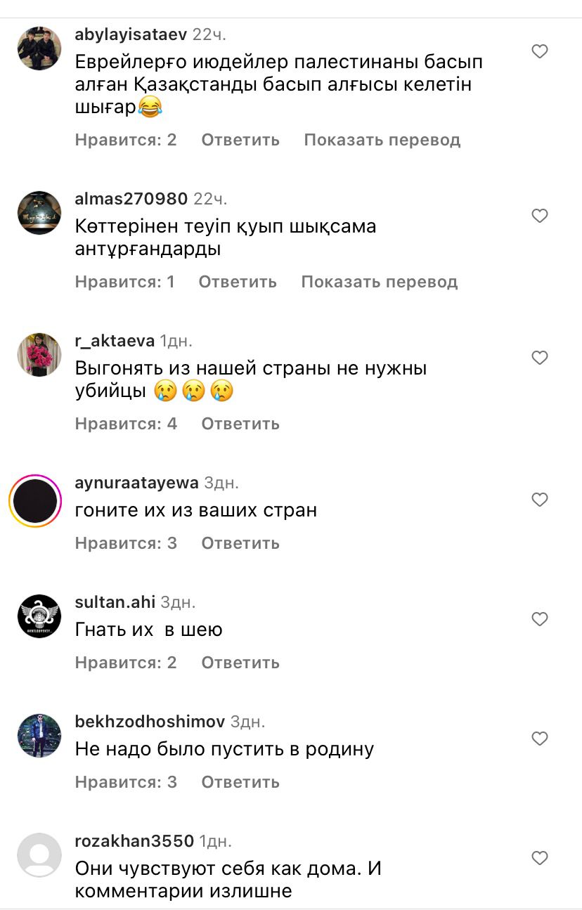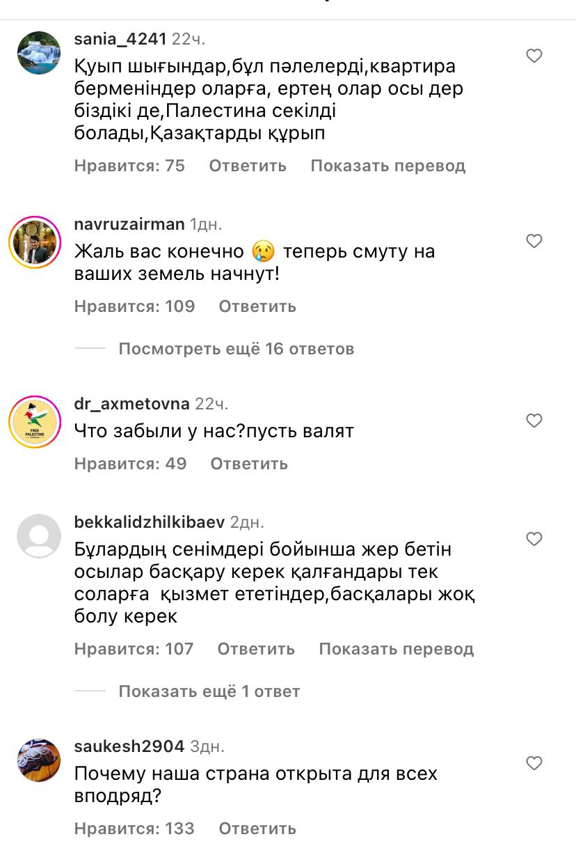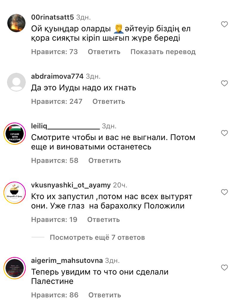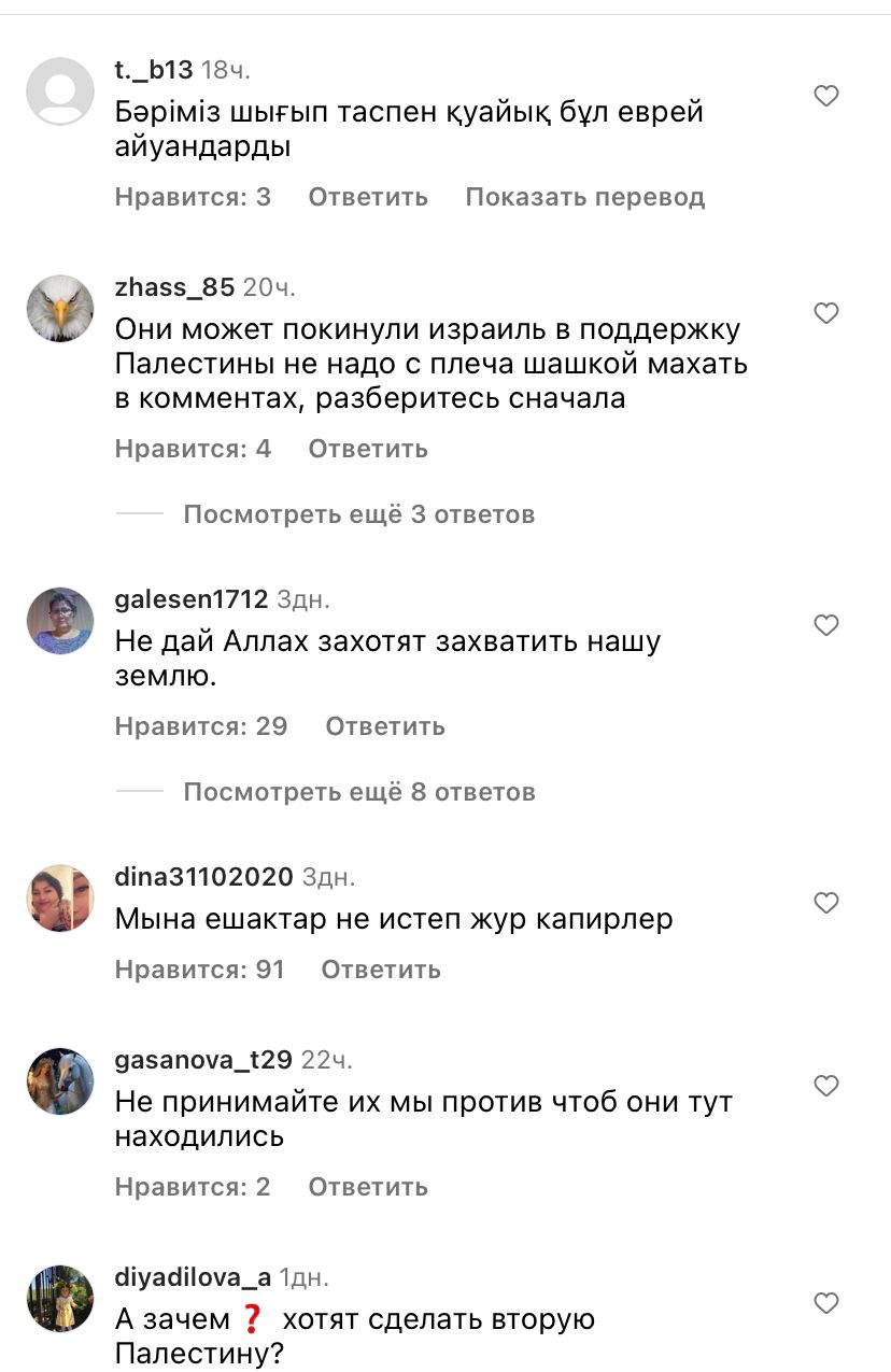 Көпшілік: "Бұлар мұнда не істеп жүр, бұл бәлелерді, квартира бермеңдер, ертең осы жер біздікі деп, Палестина секілді боламыз", "Ой, қуыңдар. Әйтеуір біздің ел қора сияқты кіріп шығып жүре береді", "Енді олардың Палестинада не жасағанын көреміз", "Еврейлер Палестинаны басып алған. Қазақстанды басып алғысы келетін шығар", "Елден қуу керек", — деген сынды ашулы пікірлер жазды.